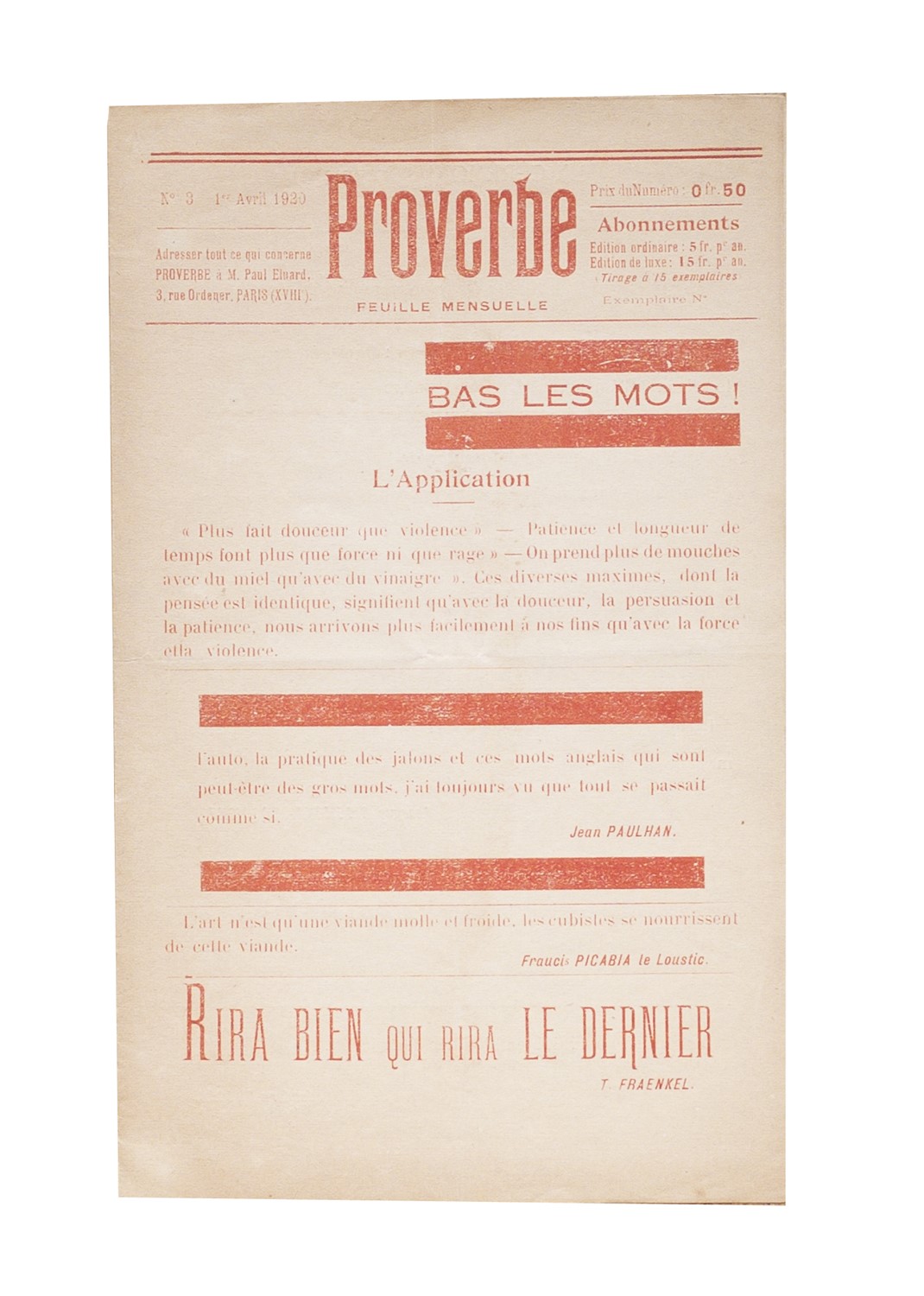 Proverbe - n. 3. Bas le mots!Parigi, Paul Eluard, 1 aprile 1920, 22,5 cm., plaquette, pp. [4], testo stampato in rosso su fondo beige.