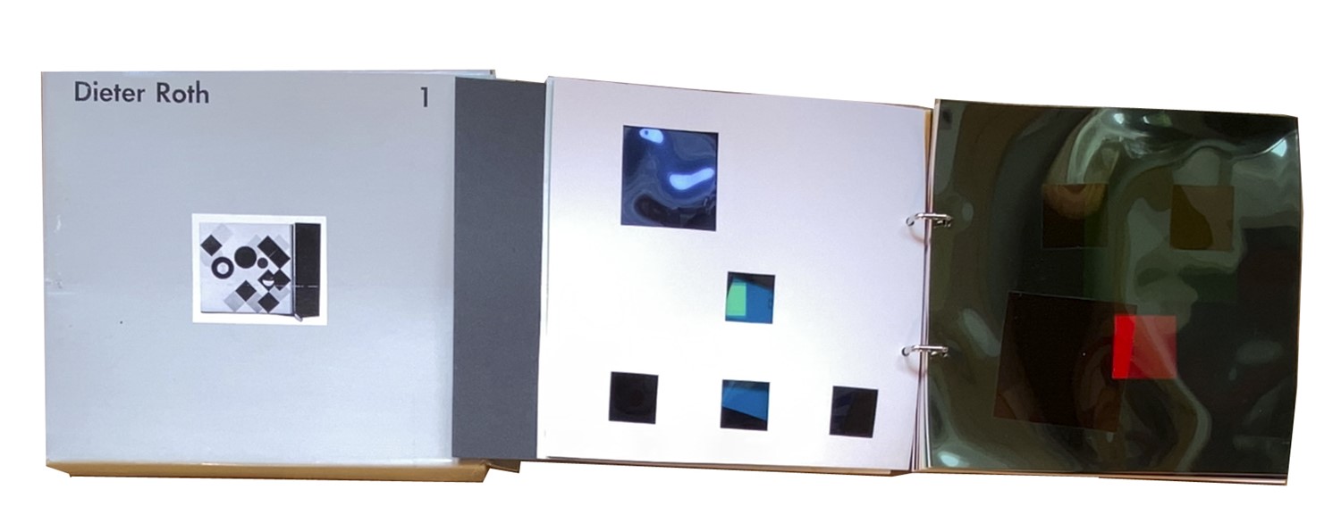 Opera pubblicata nel 1976 come primo volume una ambiziosa collana progettata dall’editore Hansjorg Mayer che intendeva ristampare di tutti i libri d’artista di Dieter Roth, La scatola contiene un foglio di cm 23x23 stampato in bianco e nero con il frontespizio e il colophon e due libri d’artista che riproducono in facsimile i primi due progetti di Roth realizzati Reykjavik negli anni Cinquanta (1954-1957). Il primo volume, intitolato “Kinderbuch”, è rilegato con una spirale ed è costituito da ventotto pagine non numerate illustrate con figure geometriche colorate variamente fustellate. Il secondo, intitolato “Bilderbuch” è costituito da un contenitore in cartone a doppio anello e 23 pagine in cartoncino bianco e fogli in acetato colorati perforati per l’archiviazione e variamente fustellate. Tiratura di 1000 esemplari. Edizione originale.