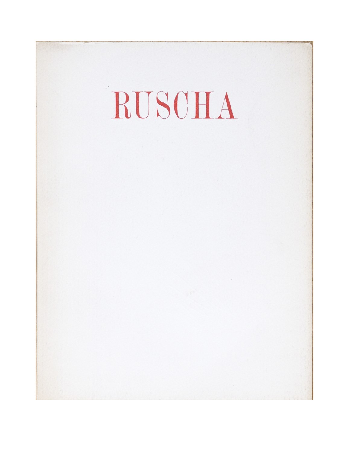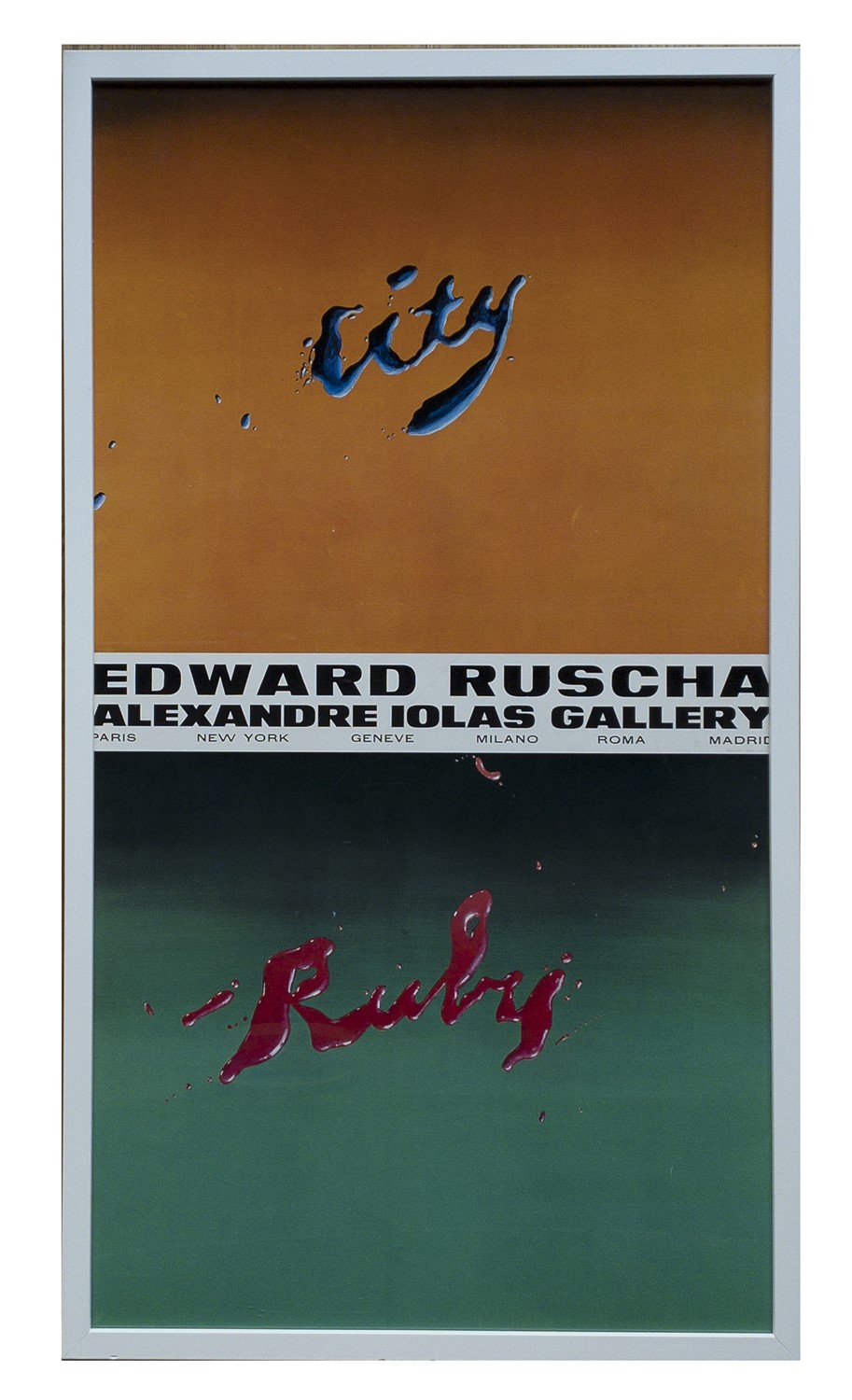 Poster stampato in fotolitografia a colori e illustrato a con due lavori dell’artista: “City” e “Ruby”, edito in occasione della mostra personale tenutasi presso la Alexandre Iolas Gallery nel 1970. - Unito: RUSCHA Edward, Edward Ruscha, New York, Alexandre Iolas [Stampa: Sergio Tosi, Milano], 1970; 21,2x16,1 cm, brossura, pp.[36] esclusa la copertina, catalogo illustrato con 14 immagini fotografiche di cui 1 in bianco e nero e 13 a colori. Catalogo edito in occasione della mostra tenutasi alla galleria Alexandre Iolas di New York nel 1970.