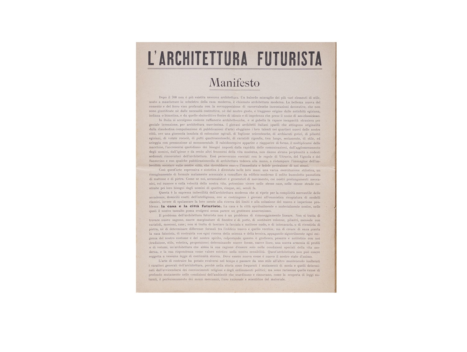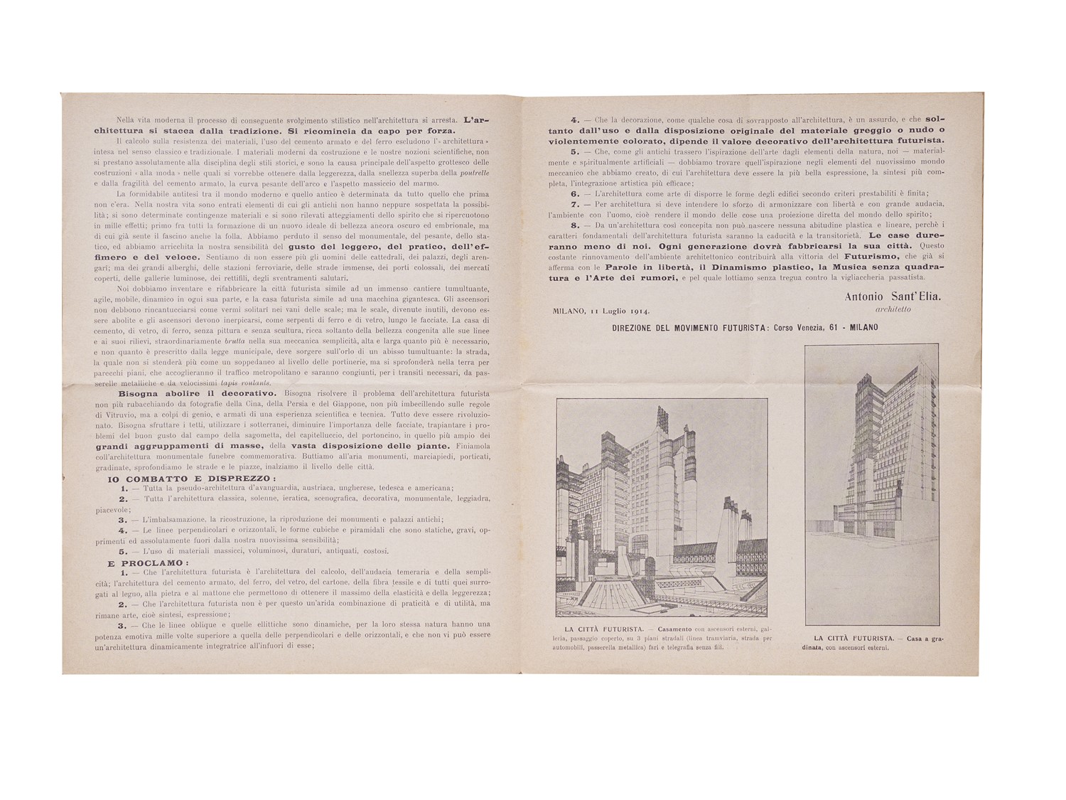 L’Architettura Futurista. ManifestoMilano, Direzione del Movimento Futurista, [stampa: Stab. Tip. Taveggia - Milano], 1914 (11 luglio), 29,2x23 cm., plaquette, pp. [4].
