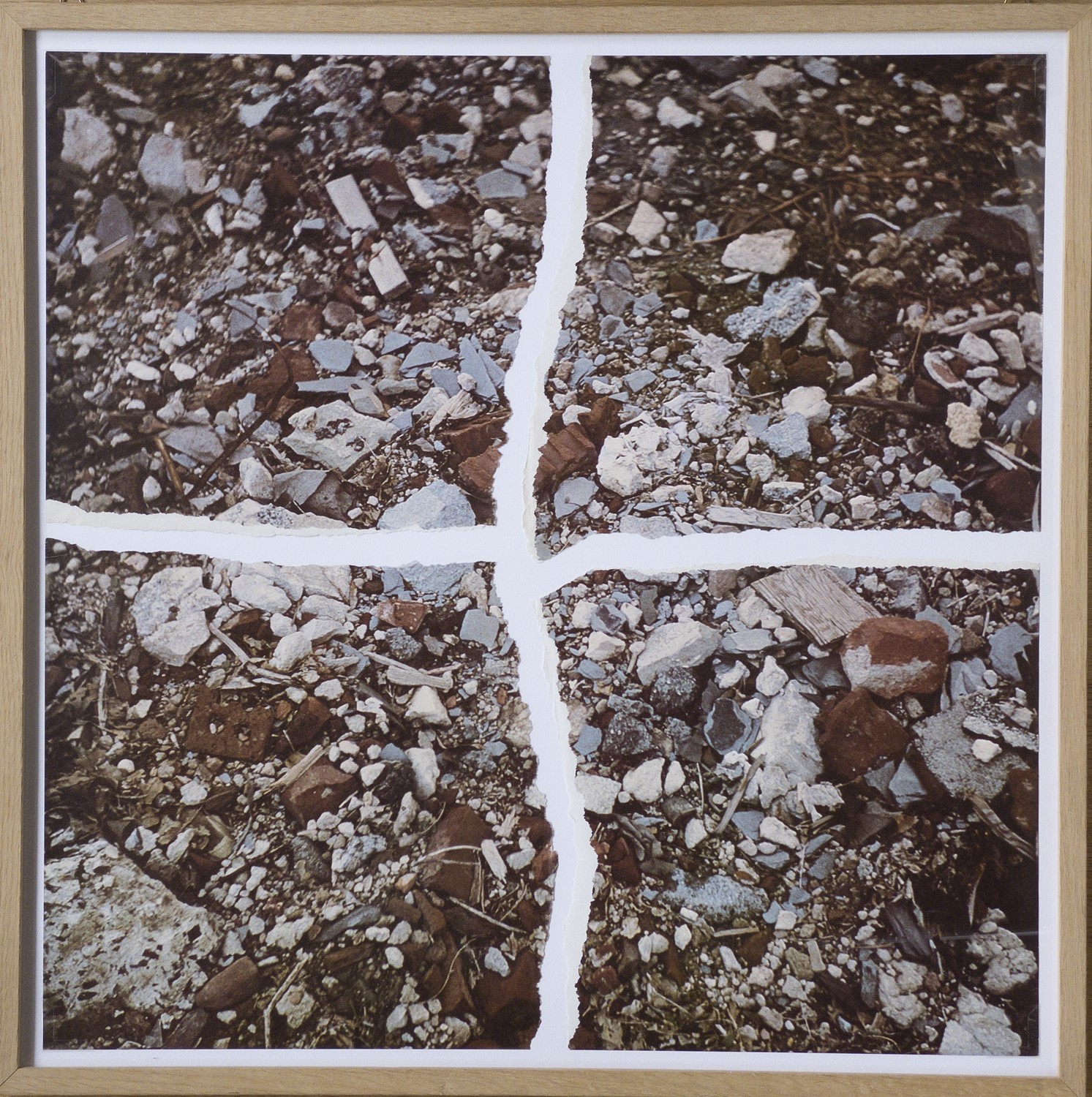 Torn photograph from the 2nd stop (Rubble). A primarily brown, red, and gray snapshot of dirt and rocks - “general rubble”New York, NY., Multiples Inc., in association with Colorcraft Inc.,, 1970, 60x60 cm. (ricomposto)