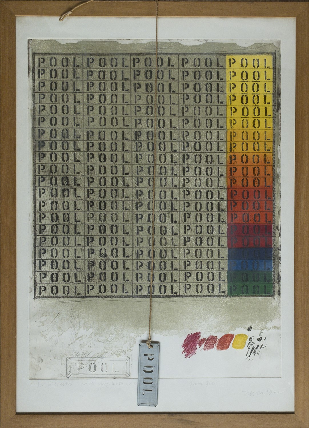 Edizione a cura dell’artista, acquaforte e acquatinta a colori con inserti a collage e un pendaglio costituito da una piastra metallica ancorata a un filo di spago fissati al margine superiore del foglio. Tiratura non dichiarata di 80 copie numerate. Esemplare firmato e dedicato dall’artista a noto grafico italiano recentemente scomparso.