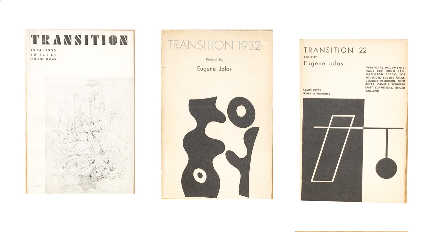 Copertina illustrata con un disegno in bianco e nero di Hans Arp, 8 illustrazioni b.n. in 5 tavole f.t. (Opere di Giocometti, Mirò e altri). Contiene il manifesto “Metanthropological Crisis”, sottoscritto da Benn, Buber, Whit Burnett, Huelsenbeck, Carl G. Jung, Ribemont-Dessaignes, Siqueiros, Soupault, Vitrac e altri, e un capitolo dedicato a Joice. Testi di Asturias, S. Beckett, H. Michaux, G. Stein, H. Arp, G. Benn, H. Ball, K. Schwitters e altri.- Unito: TRANSITION, n. 22, The Hague, Eugene Jolas - The Servire Press, February 1933, 23x15,5 cm., brossura, 179-(13), copertina con un disegno in bianco e nero di Sophie H. Tauber-Arp, contiene un capitolo dedicato a Joice (Work in Progress). Testi di Hans Arp (Konfigurationen) , Hugo Ball (Cabaret), Hamilton Basso, Joe Bousquet, Georges Pelorson, Theo Rutra, Camille Schuwer, Kurt Schwitters (Ursonate), Roger Vailland, Eugene Jolas, Stuart Gilbert, Carola Giedion-Welcker, Firedrich Marcus Huebner, Max Pulver, Mariano Brull, Ivan Black, William Van Wyck, Fritz Vanderpyl e altri.- Unito: TRANSITION, n. 23, The Hague, Eugene Jolas - The Servire Press, July 1935, 23x15,5 cm., brossura, 205-(7), copertina illustrata con la riproduzione in bianco e nero di un’opera di Paul Klee, 8 tavole fuori testo con 9 illustrazioni in bianco e nero (opere di Naum Gabo, Henri Laurens, Umberto Boccioni, Guido Gonzales, Alberto Giacometti, Hans Arp, Constantin Brancusi, Jaques Lipchtz, Raymond Duchamp-Villon), un capitolo dedicato a Joice. Testi di Eugene Jolas, Georges Pelorson, Hans Schless, Margaret Shedd, Gustave Barroso, Alejo Carpentier, Leo Frobenius, Lothar Mundan, Thérèse Aubray, Camille Schuwer, e altri. Allegato il “Transition Pamphlet no. 1”, brossura, pp. 16 (incluse le copertine) con testi di Eugene e Maria Jolas, Georges Braque, Henri Matisse, André Salmon, Tristan Tzara