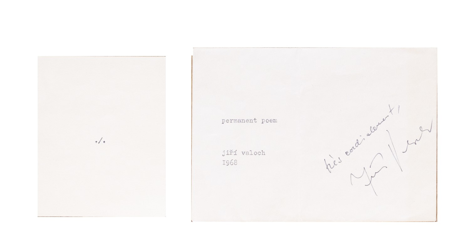 Opera costituito da un busta di cm. 16x11,5 con il titolo stampato in ciclostile, contenente un foglietto di cm. 10,5x8,5. Sul foglietto è tratteggiato, di pugno dell’autore, il simbolo “. / .”, che indica per convenzione l’interruzione di un testo che prosegue nelle pagine successive. La busta è piegata in modo da sagomare il foglietto. Esemplare con invio autografo dall’artista.