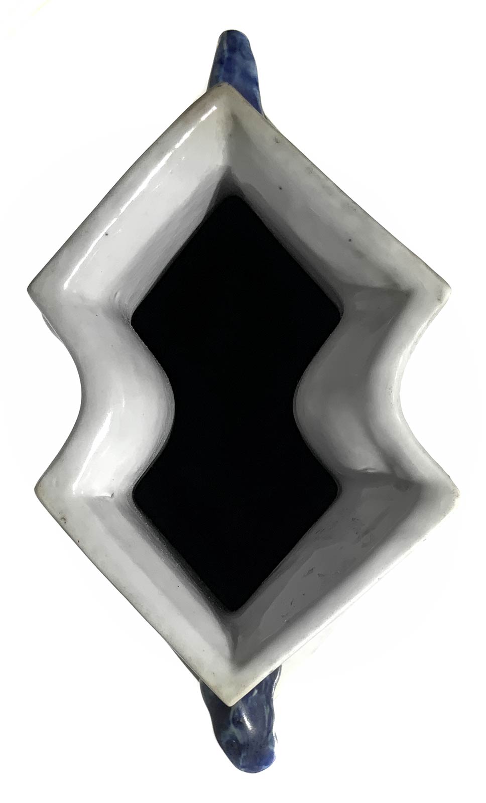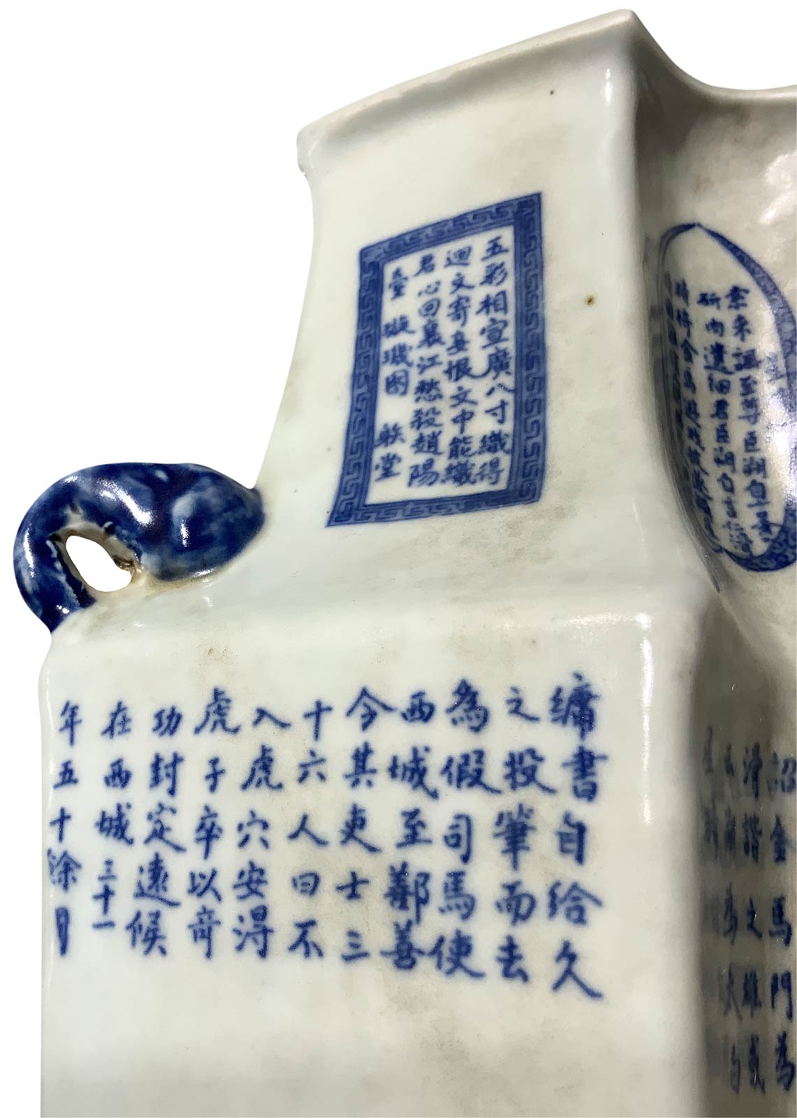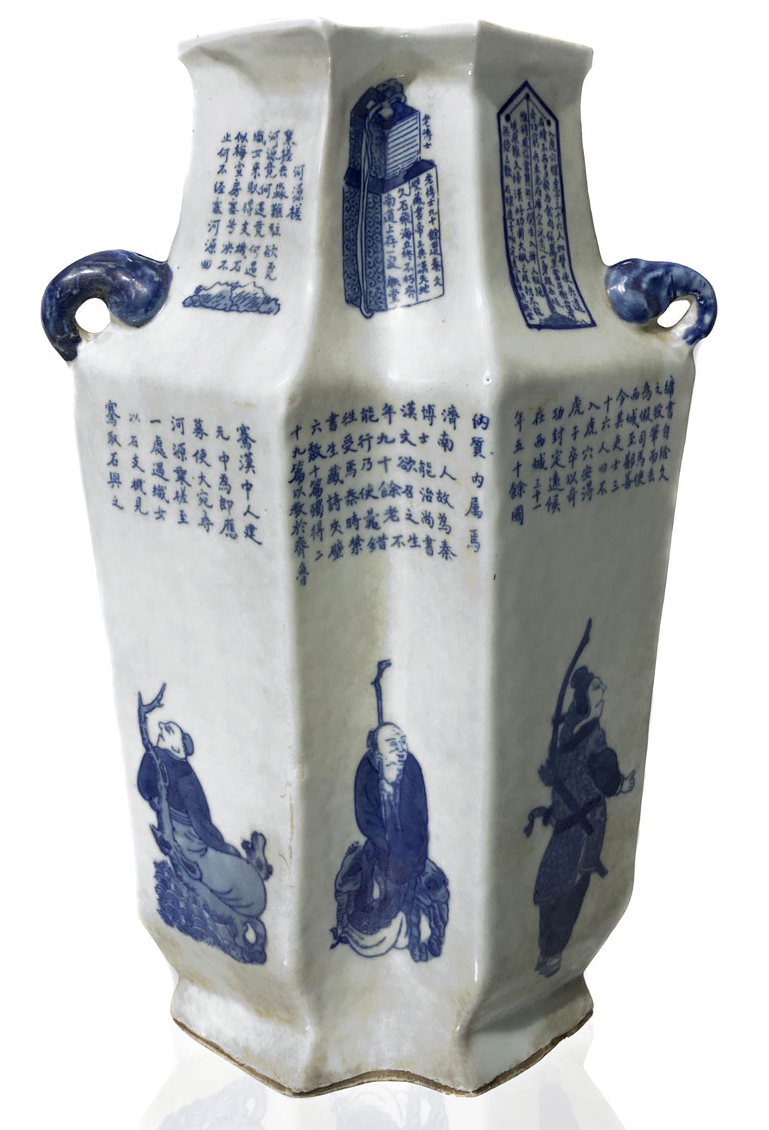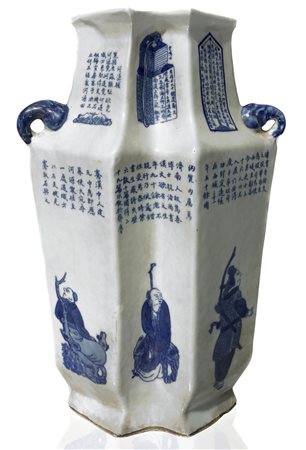 Vaso cinese in porcellana con figure e testi dell’antico libro del Wu Shuang Pu, Cina, XIX/XX secolo. Profilo articolato a sezione romboidale, biansato. Decorazione blu/bianco cm 26x17x9.