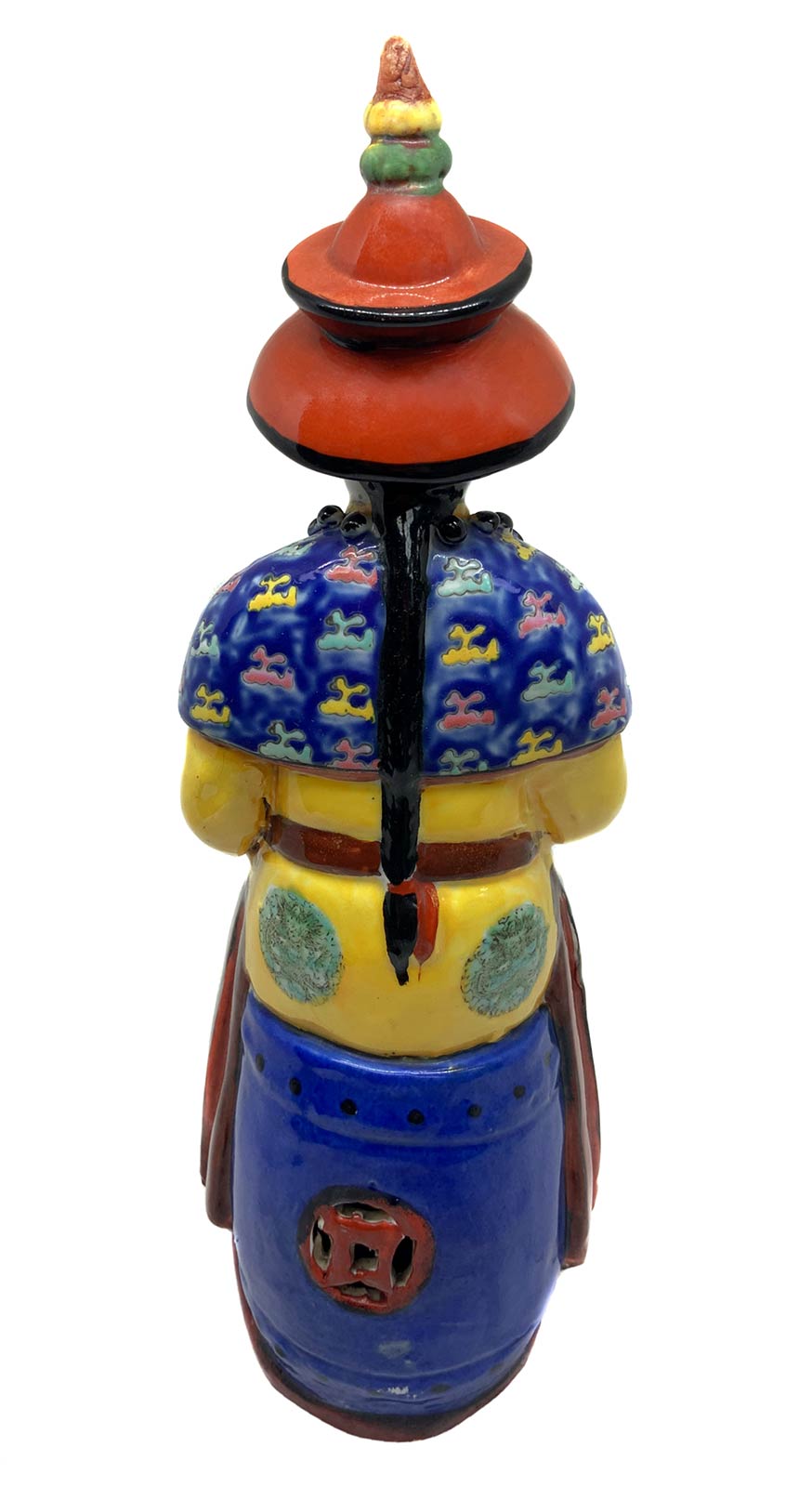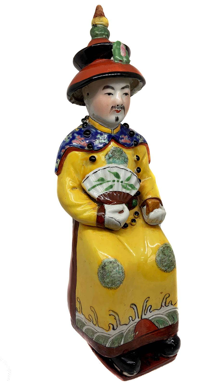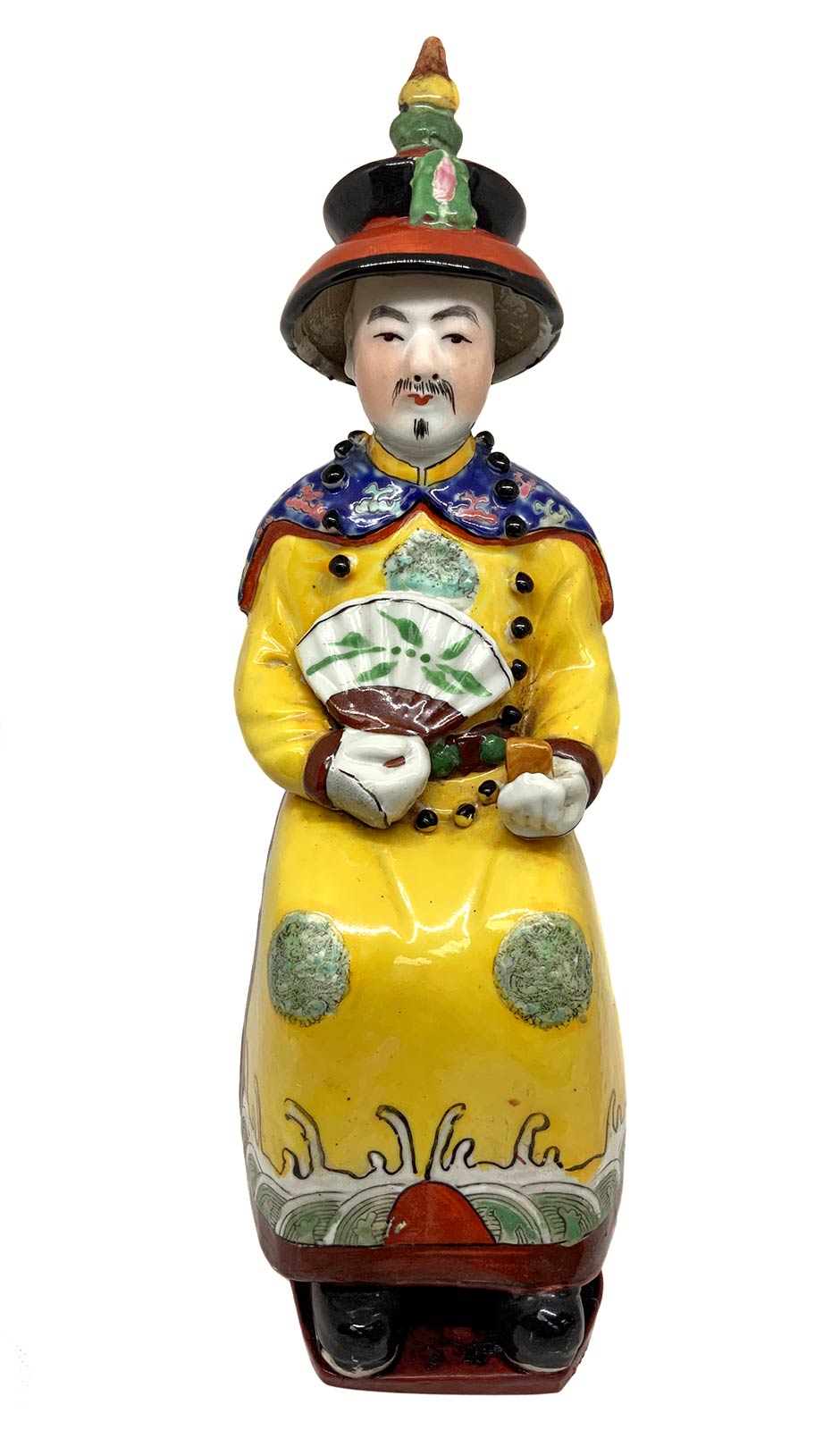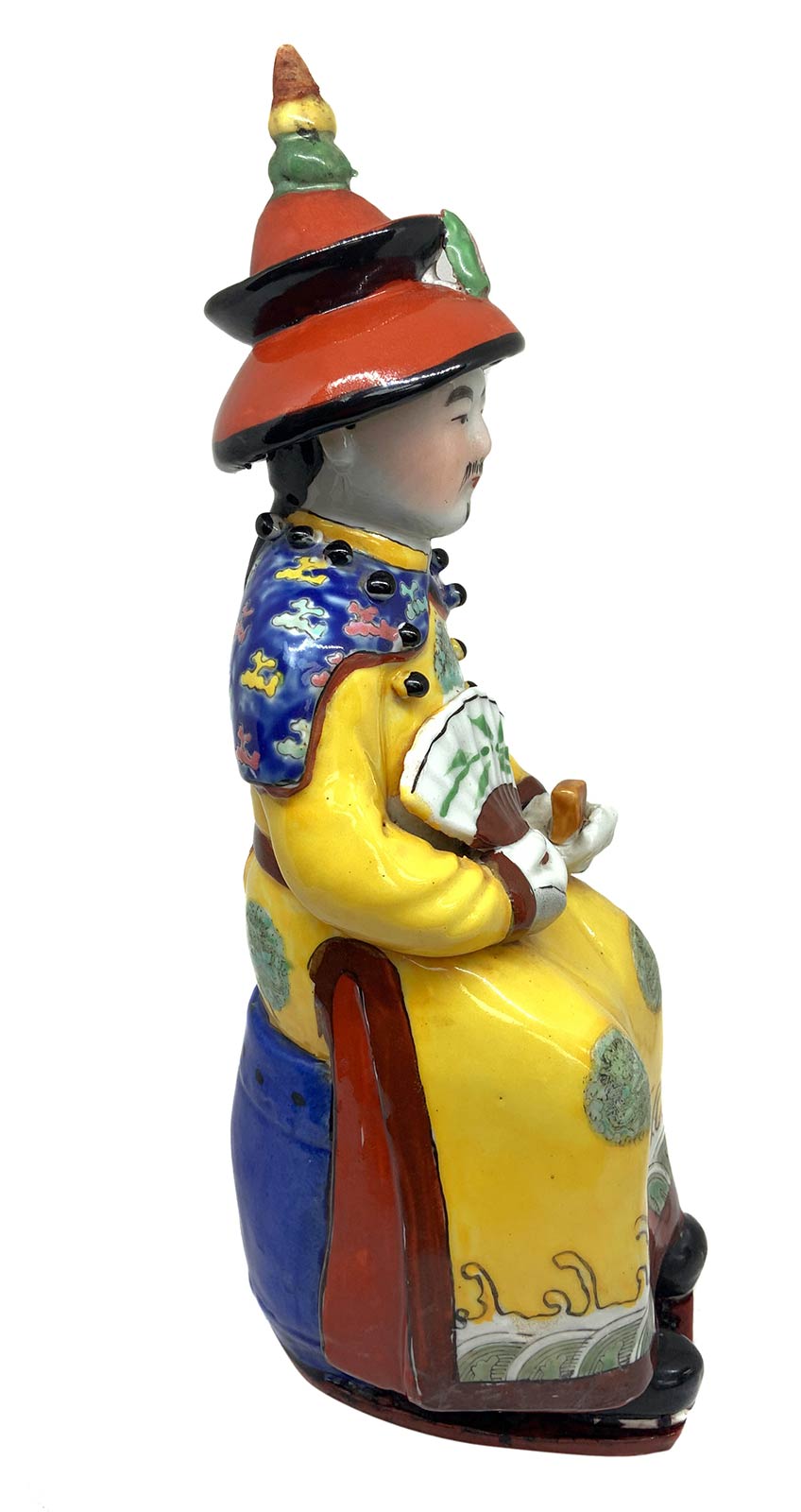 Scultura di dignitario in porcellana con decorazione policroma, Cina, XX...
