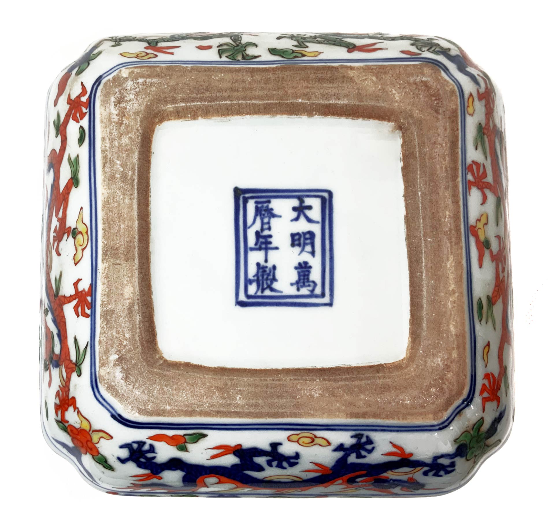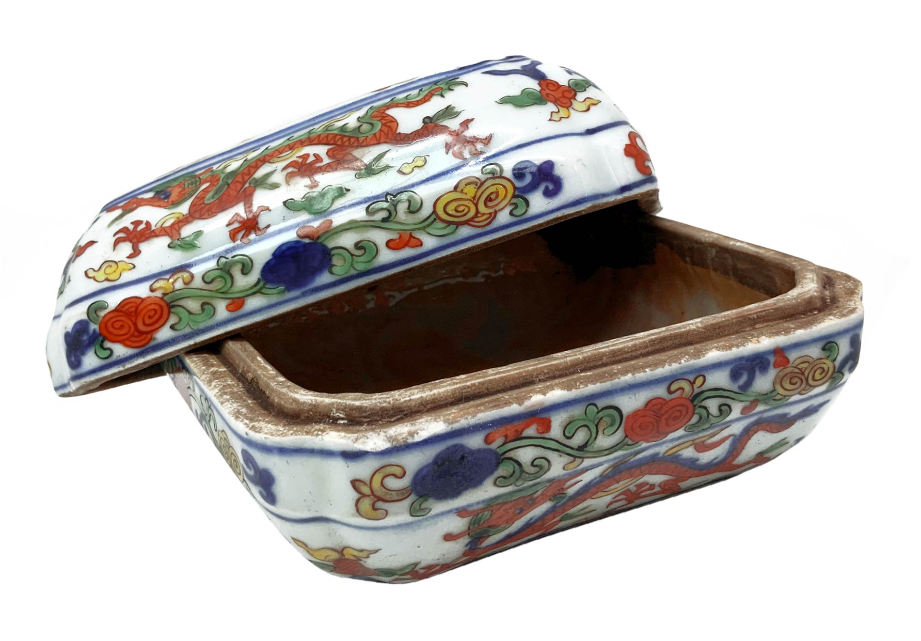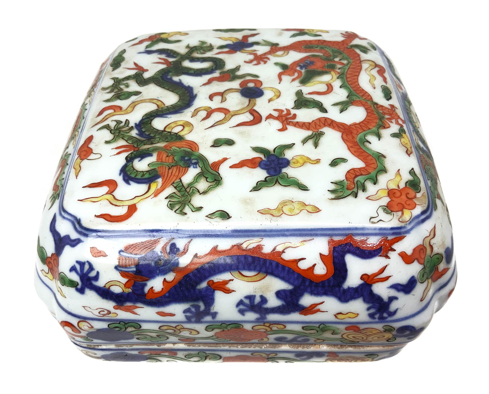 Lot 74 | Scatola in porcellana “wucai” con decorazione di draghi, Cina XX secolo. Cm...
