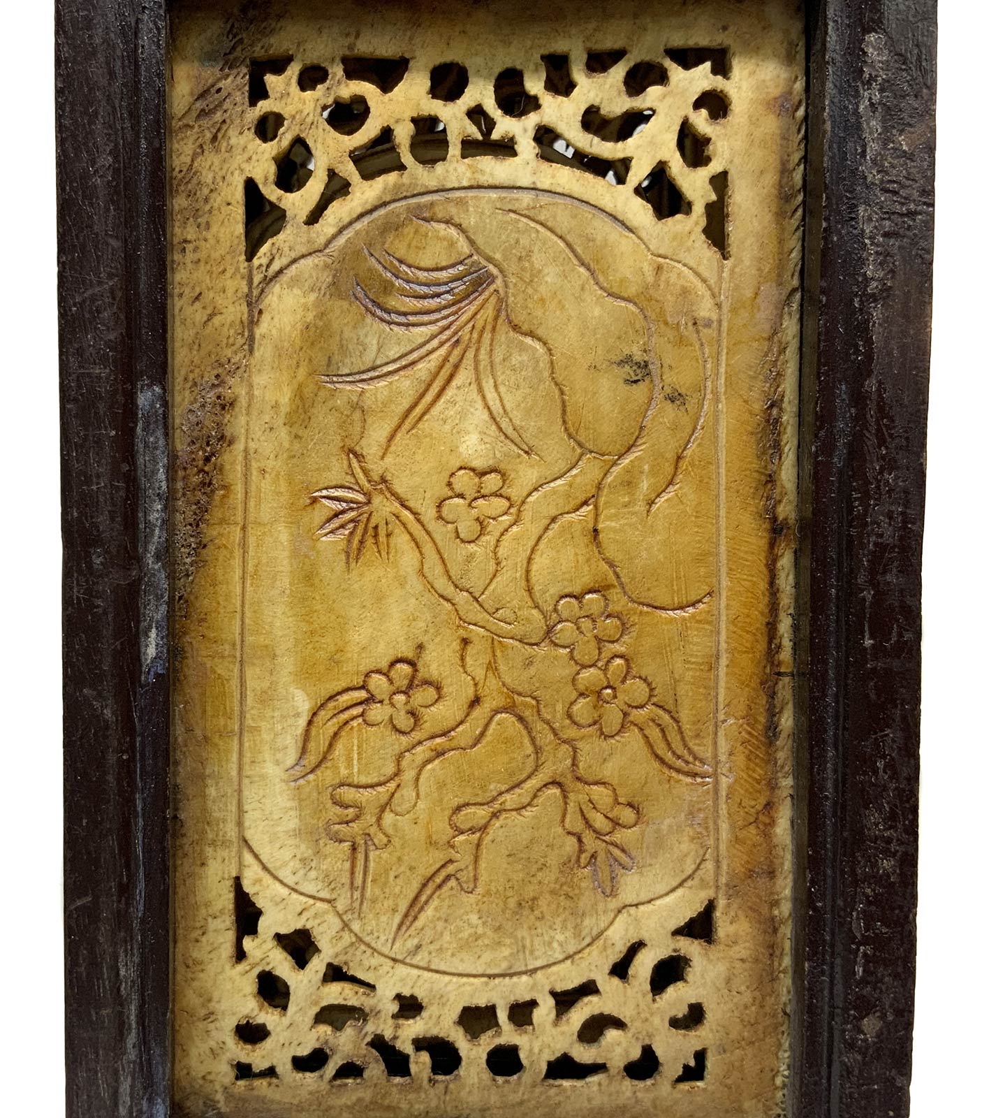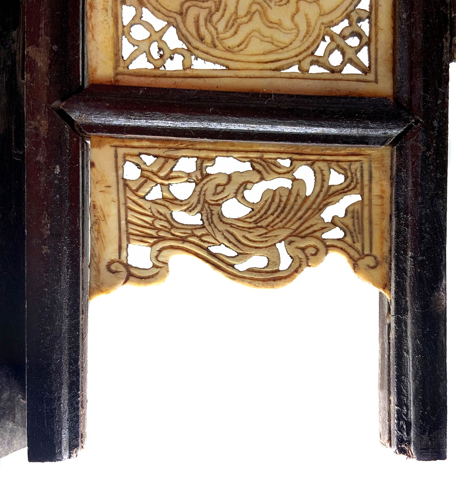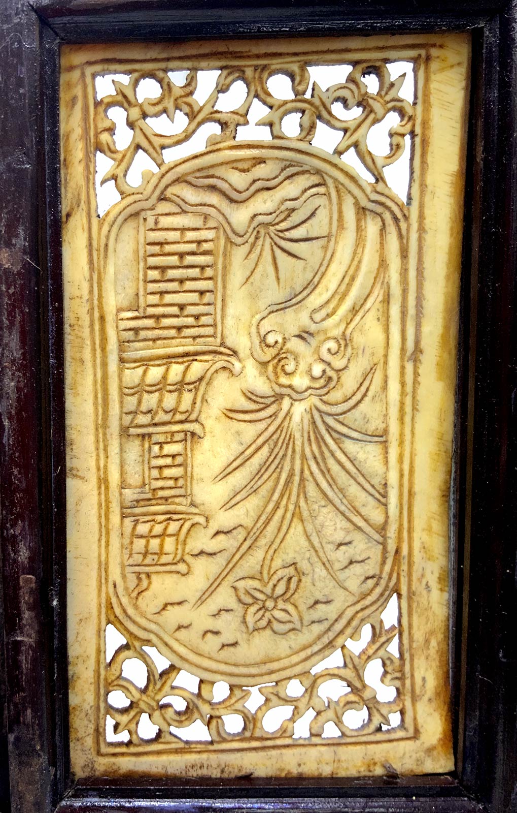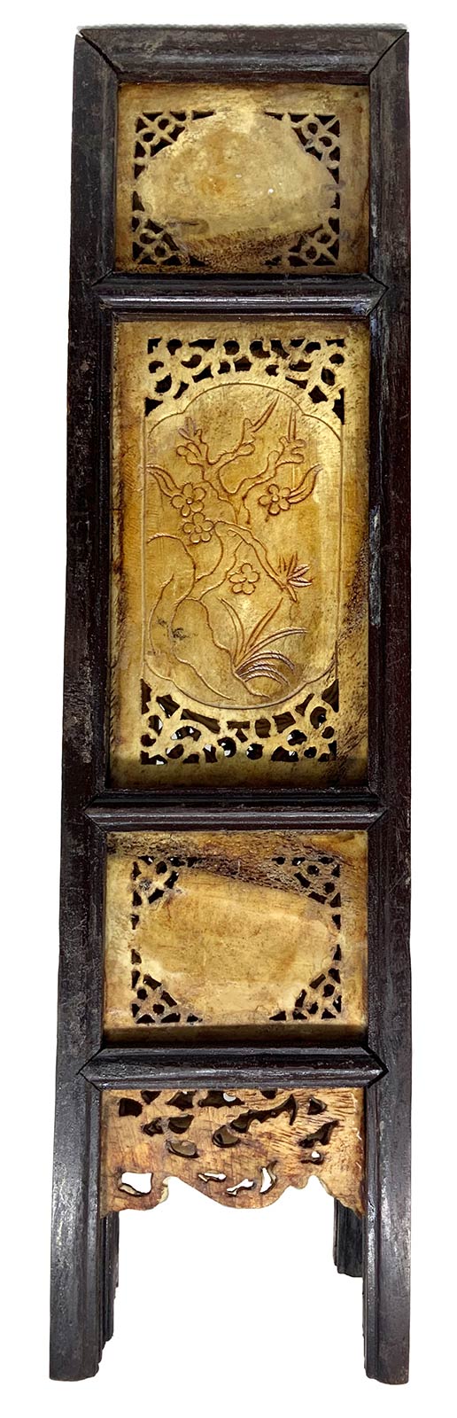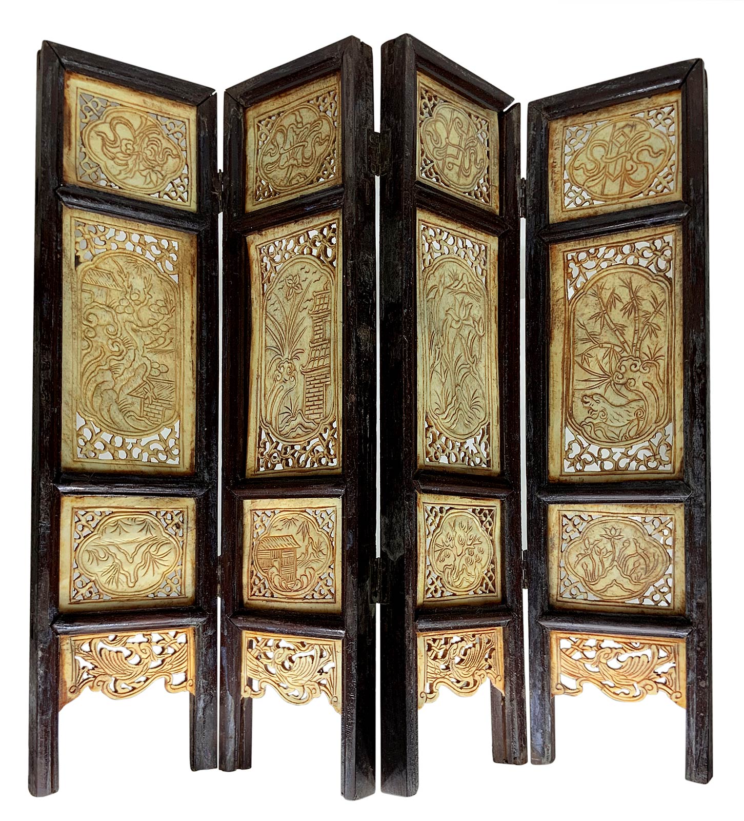 Paravento da tavolo in osso decorato e lavorato a traforo. Cina. Cm H 34, larg. 37. Ogni pannello cm 8,5.