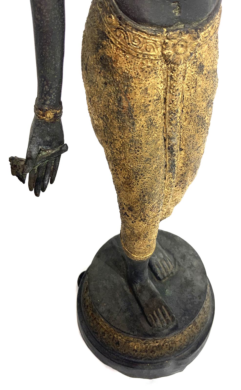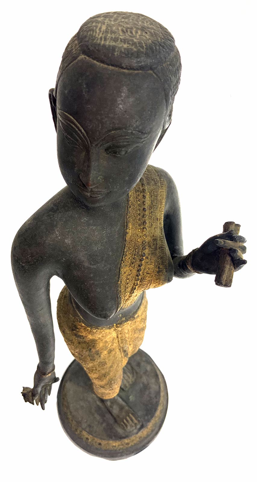 Statua in metallo di donna con fiore tra le dita, doratura nel vestito. Thailandia, H Cm 53
