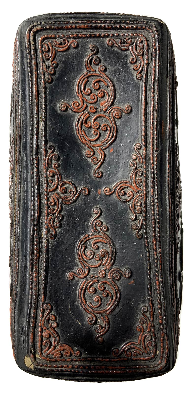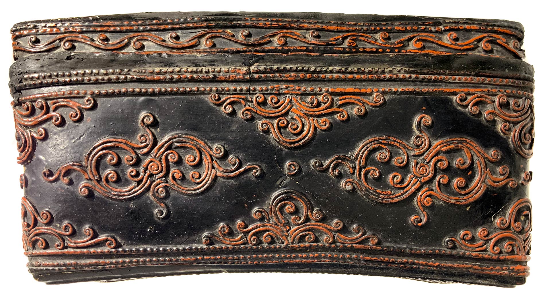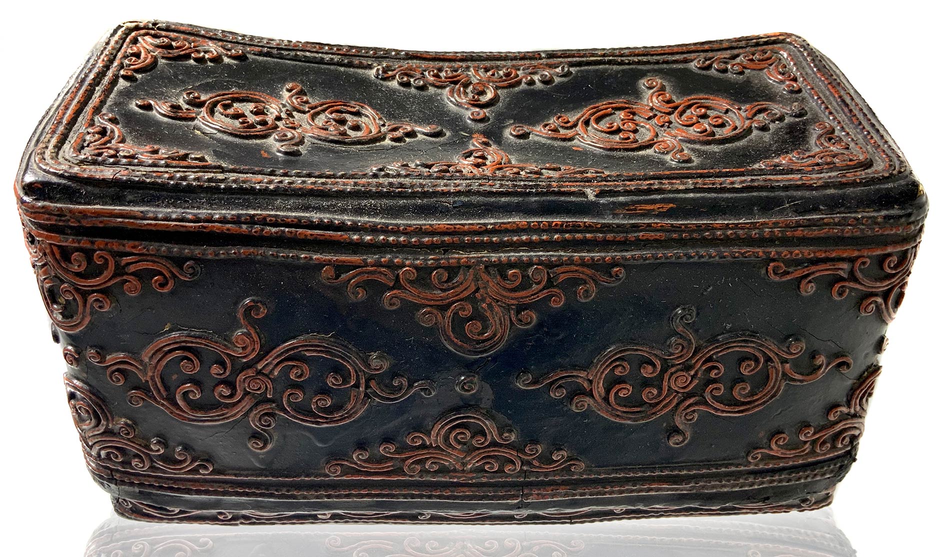 Scatola in bamboo laccato in nero e decorato finemente a rilievo con lacca rossa. Myanmar, XX secolo. Cm 24 x 13 x 13.