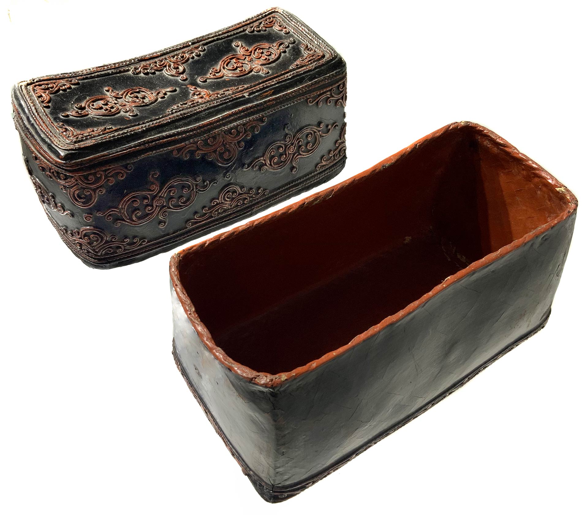 Scatola in bamboo laccato in nero e decorato finemente a rilievo con lacca...