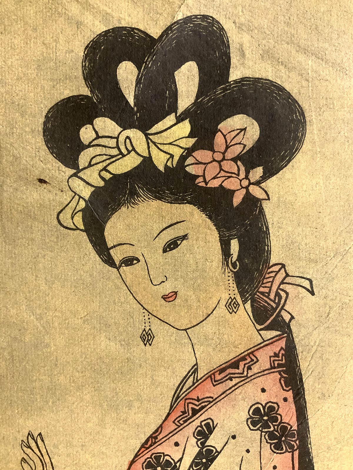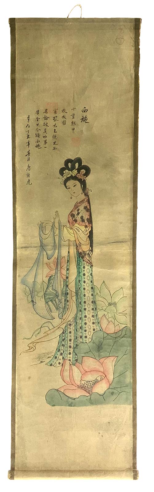 Rotolo di carta con figura di cortigiana e testi. Cina, XX secolo. Cm 130 x 35.