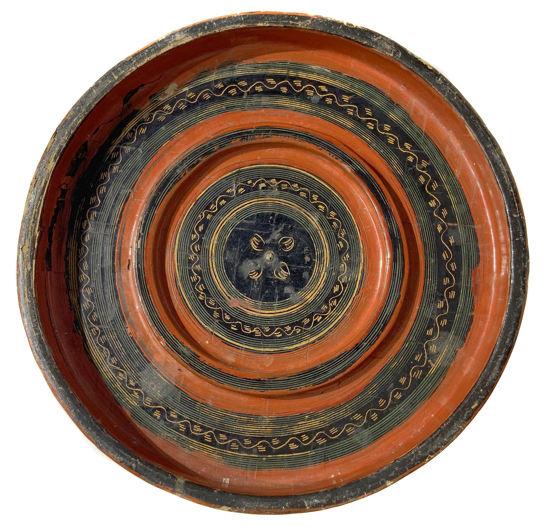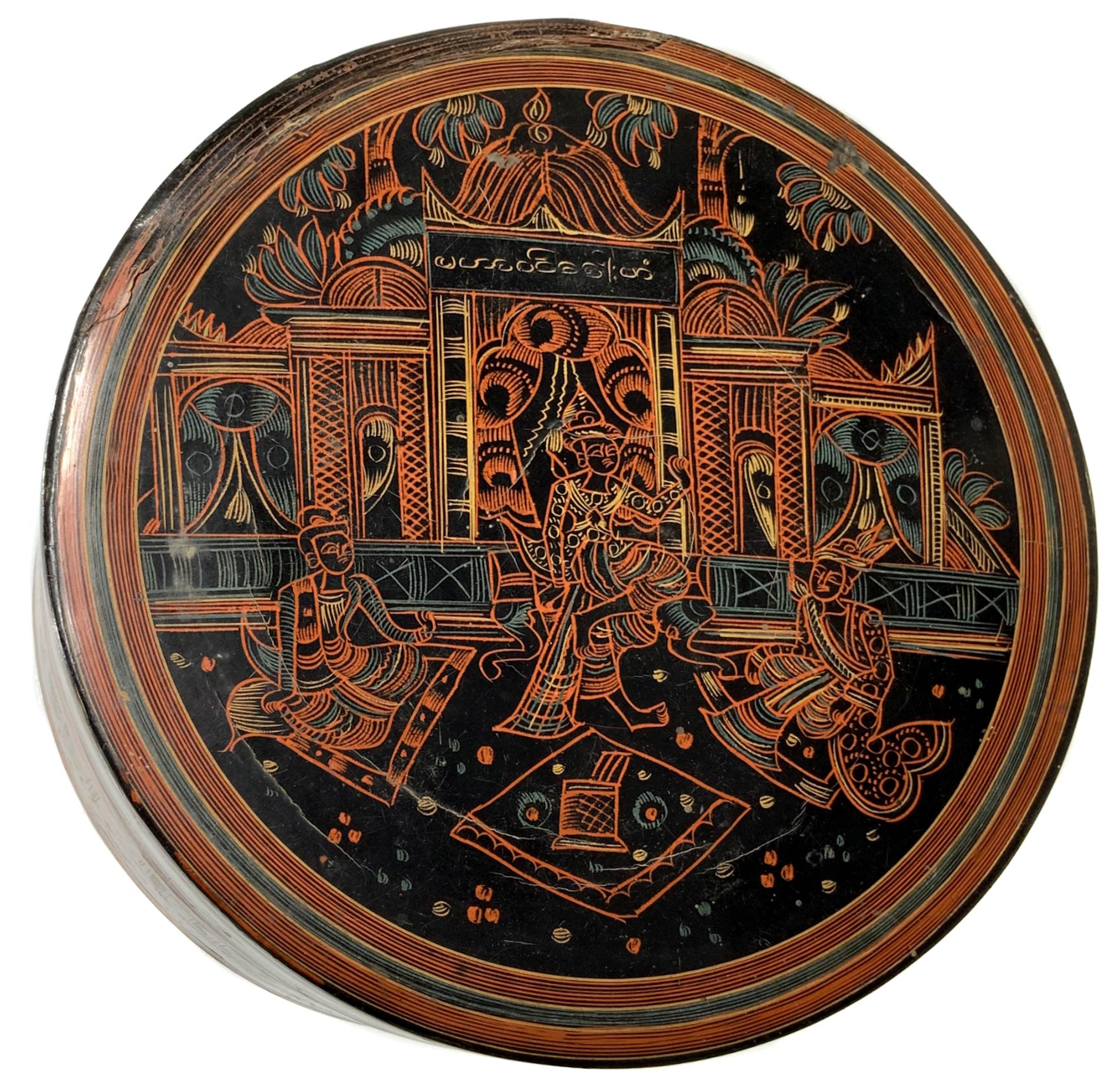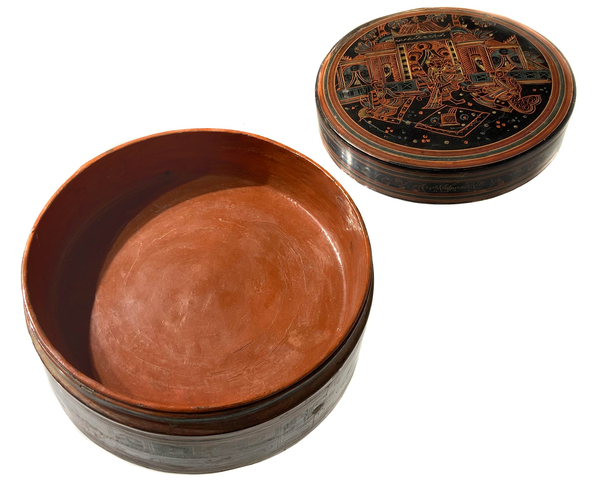 Scatola in bambù laccato in rosso e nero, Myanmar, XIX- XX secolo. Decorata...