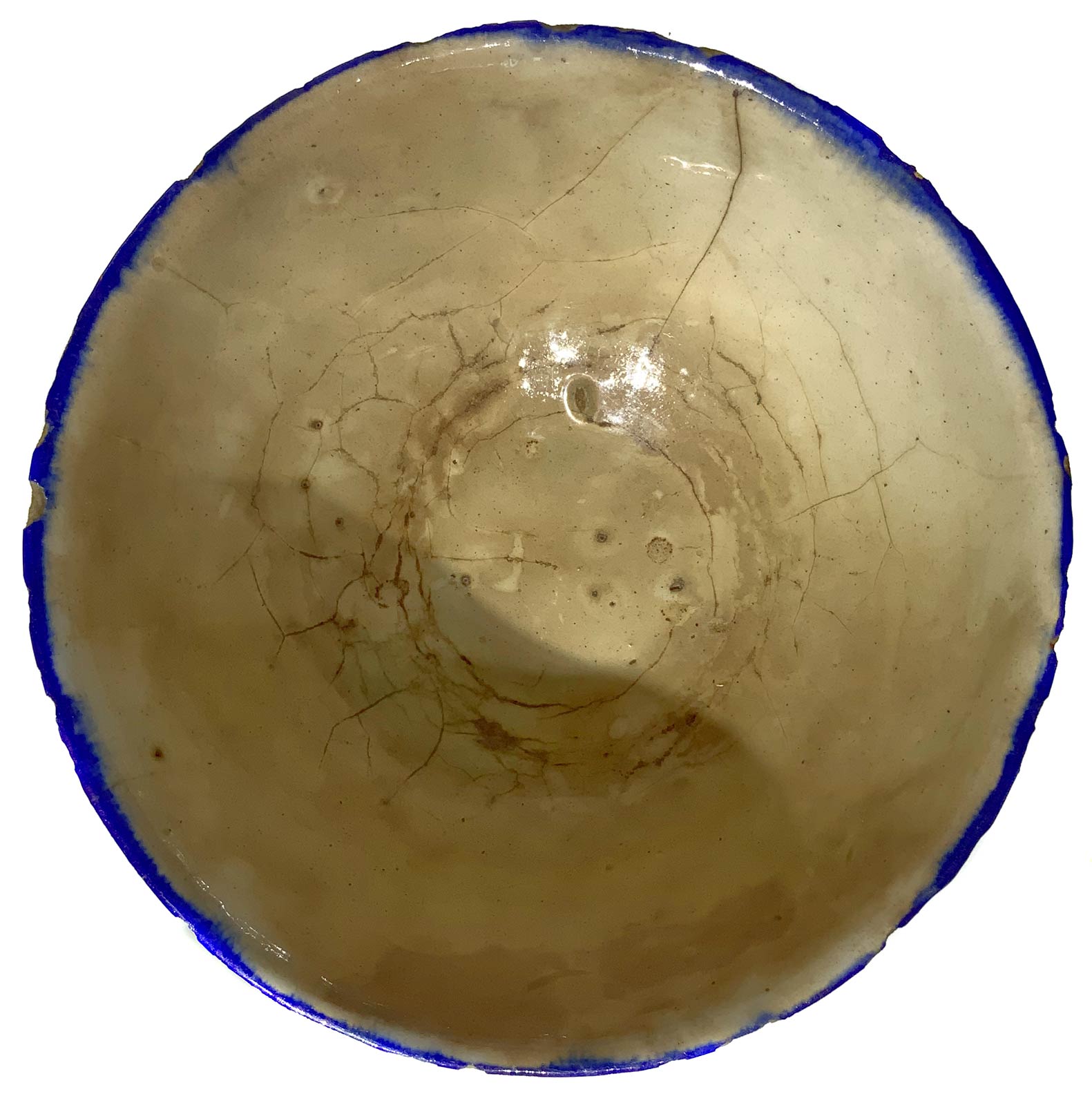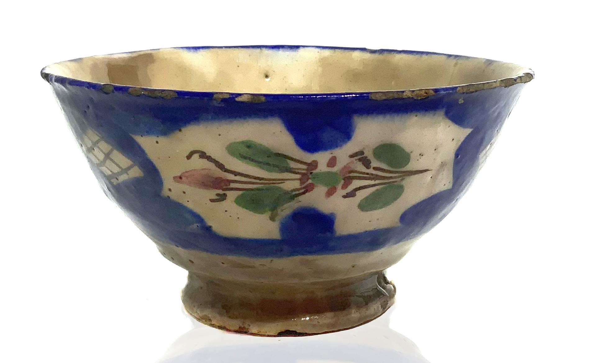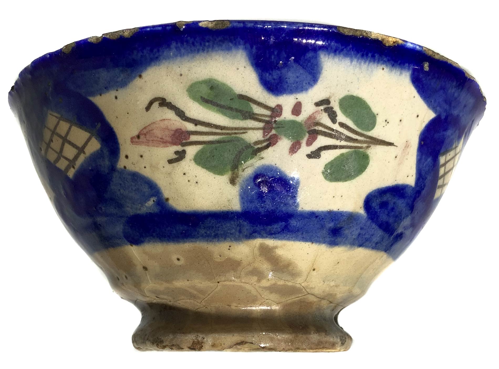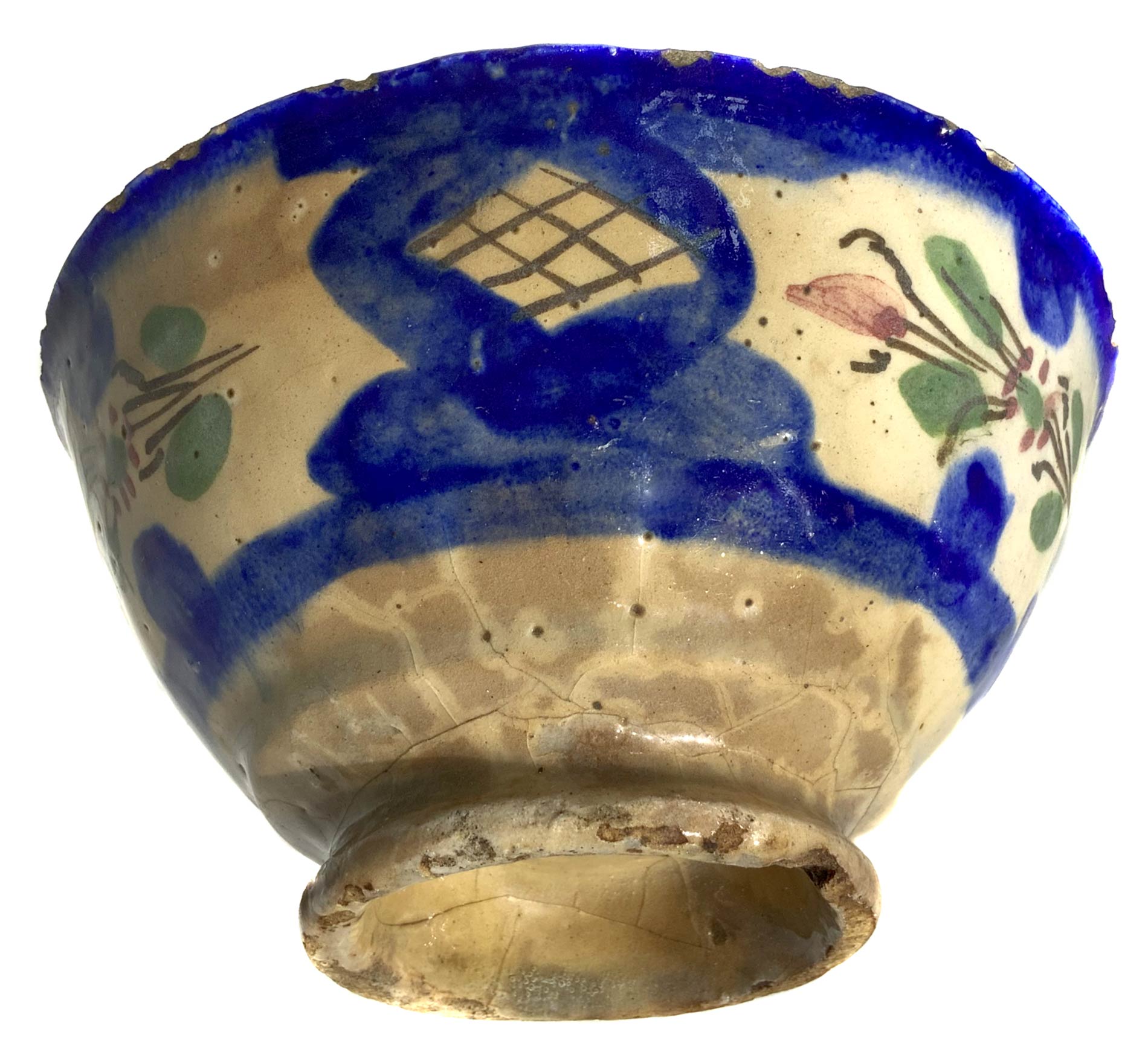 Ciotola, Persia. Decorata all’esterno con motivi floreali entro ampie linee blu e rombi. Piccole scheggiature sul bordo e sulla base.