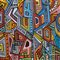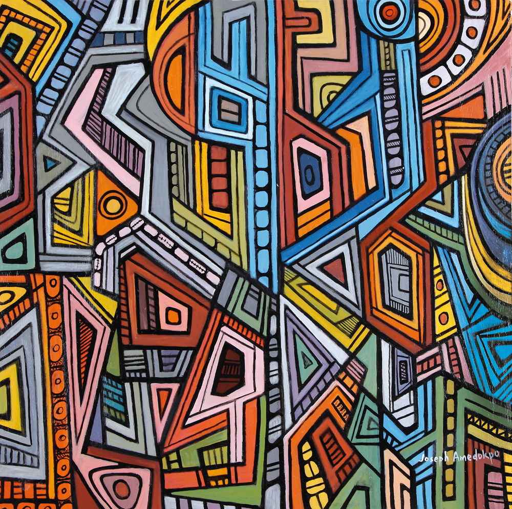 JOSEPH AMEDOKPO Vogan (Togo) 1946 An ancient African Kingdom olio su tela di sacco cm.70x70, firma in basso a destra, titolo al retro, certificato della Luca Sforzini Arte allegato.