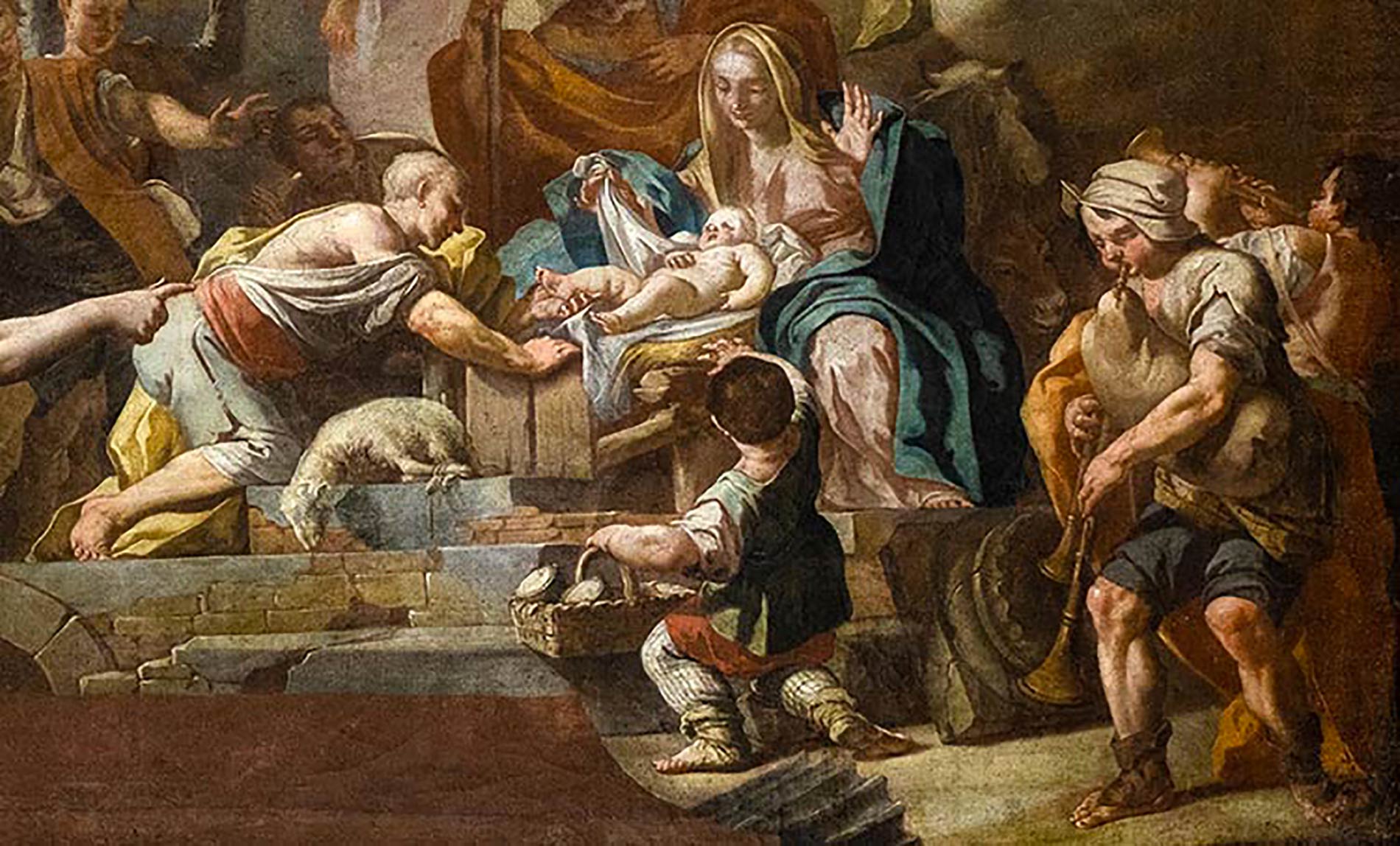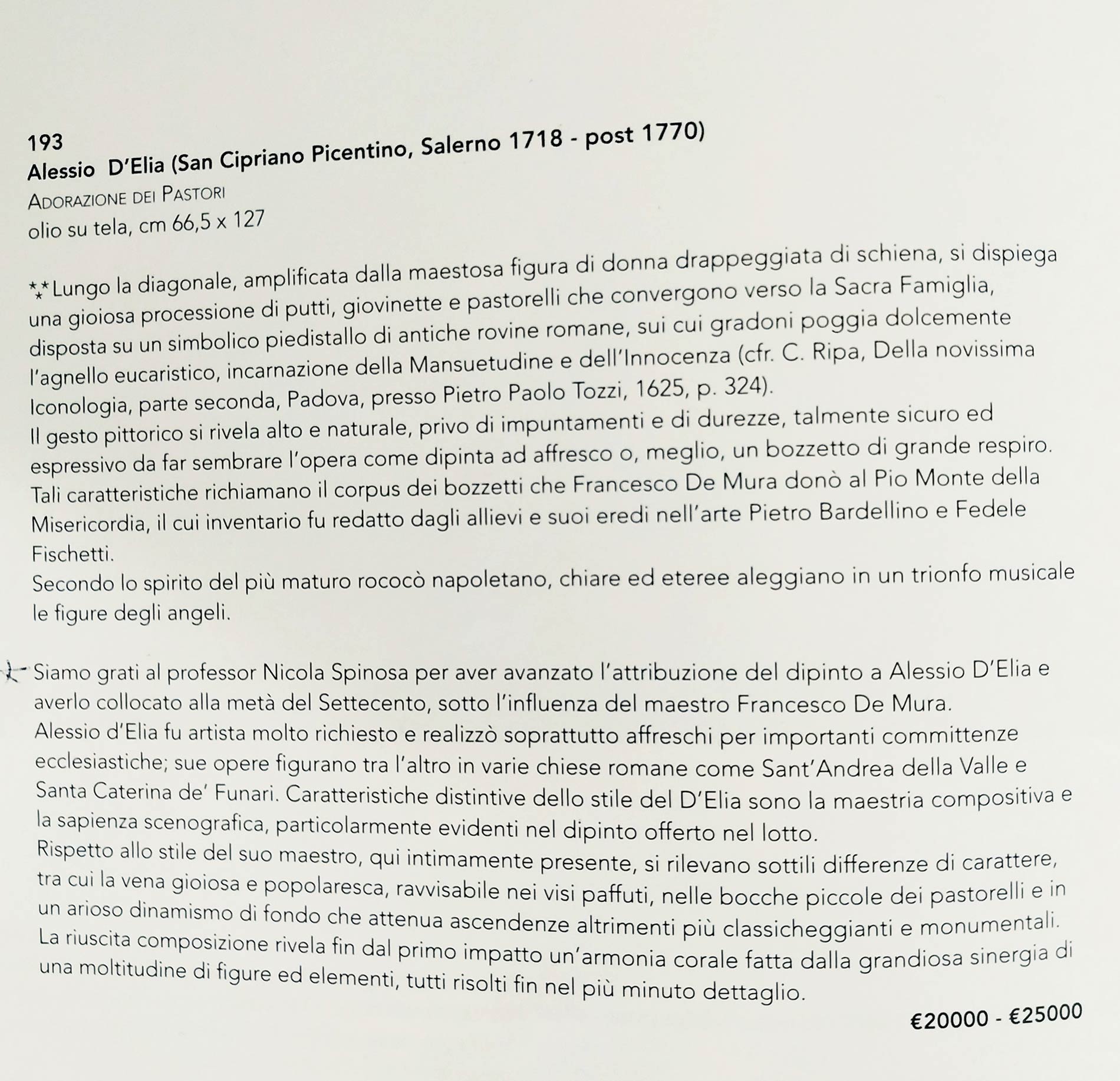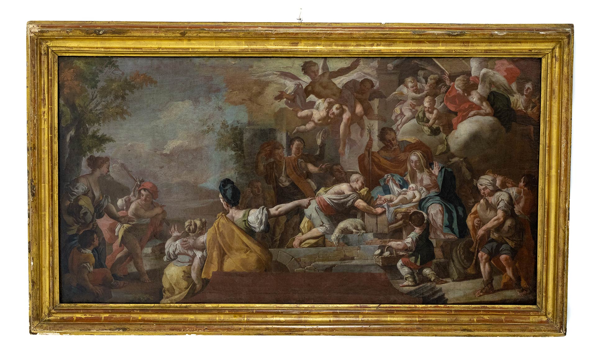 Alessio D'Elia ( San Cipriano Picentino 1718- Post 1770) Adorazione dei pastori . 66,5x127 olio su tela . Attribuzione del Prof. Nicola Spinosa . Già Casa d'Aste Finarte , Minerva Auction.