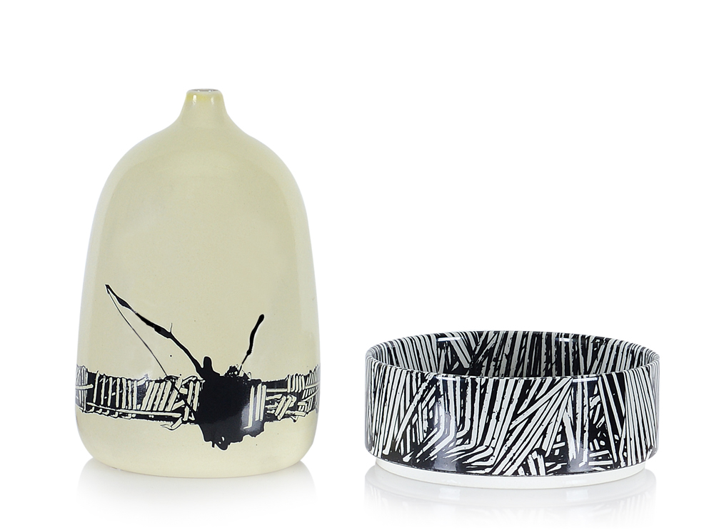 EMILIO SCANAVINO Genova 28/02/1922 - Milano 29/11/1986  Senza titolo vaso in ceramica altezza cm. 22, esemplare 27/50, firma sotto la base. Senza titolo ciotola in ceramica policroma diametro cm. 17 altezza 6,5; esemplare 1/50, firma sotto la base.