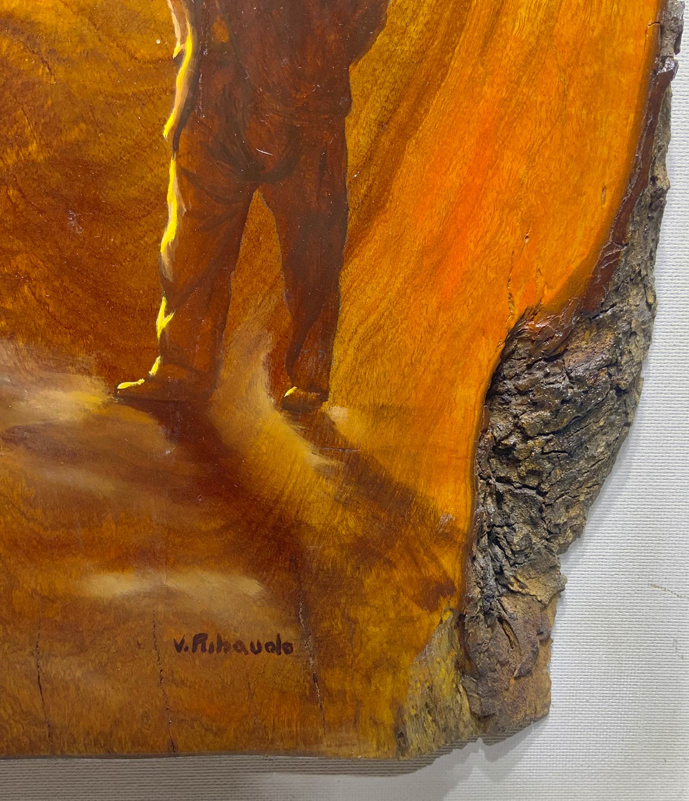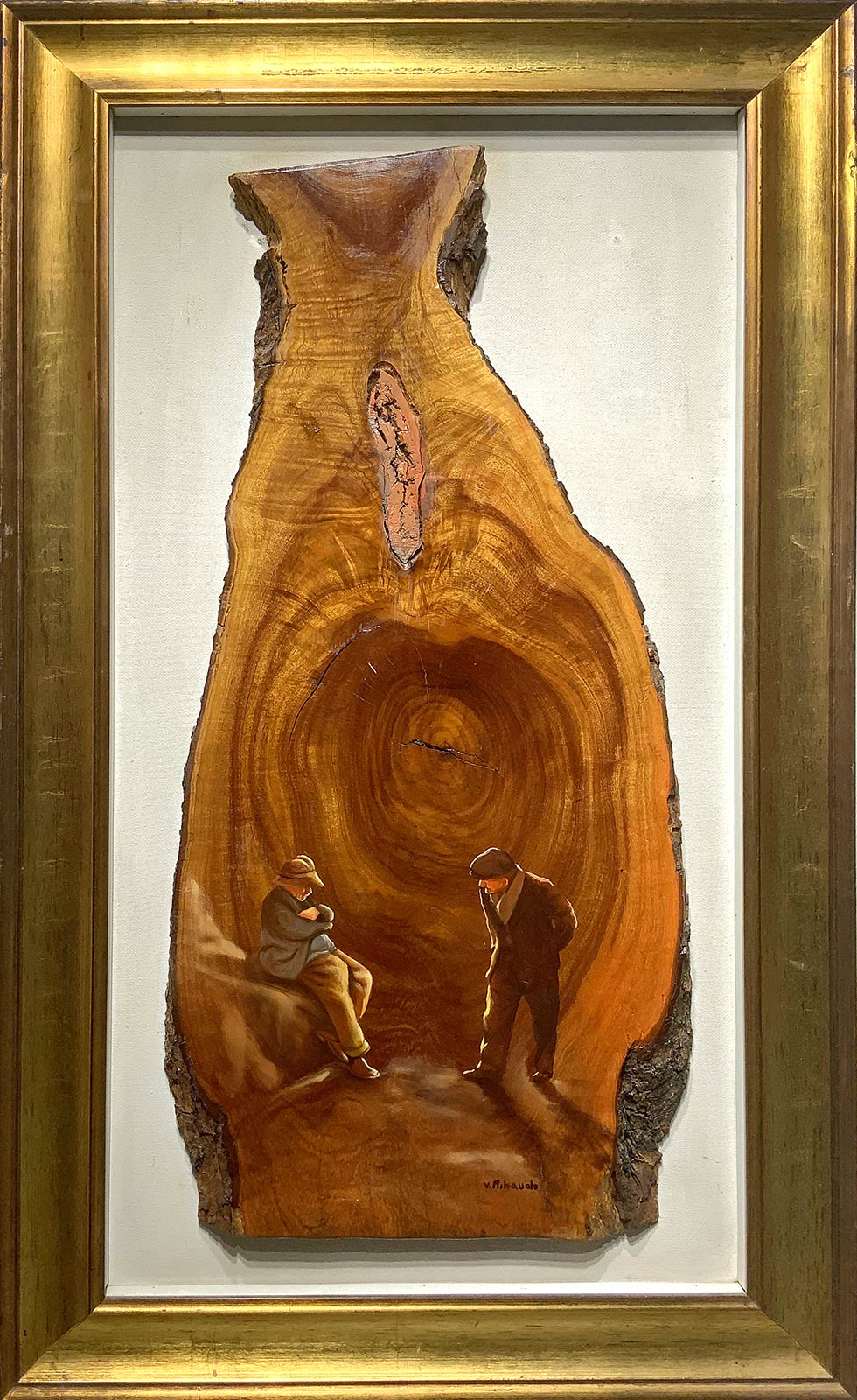 Dipinto ad olio su legno raffigurante personaggi. Titolo "Dialogo antico tratto dai racconti di Vita agreste. Cm 80x36