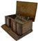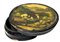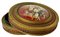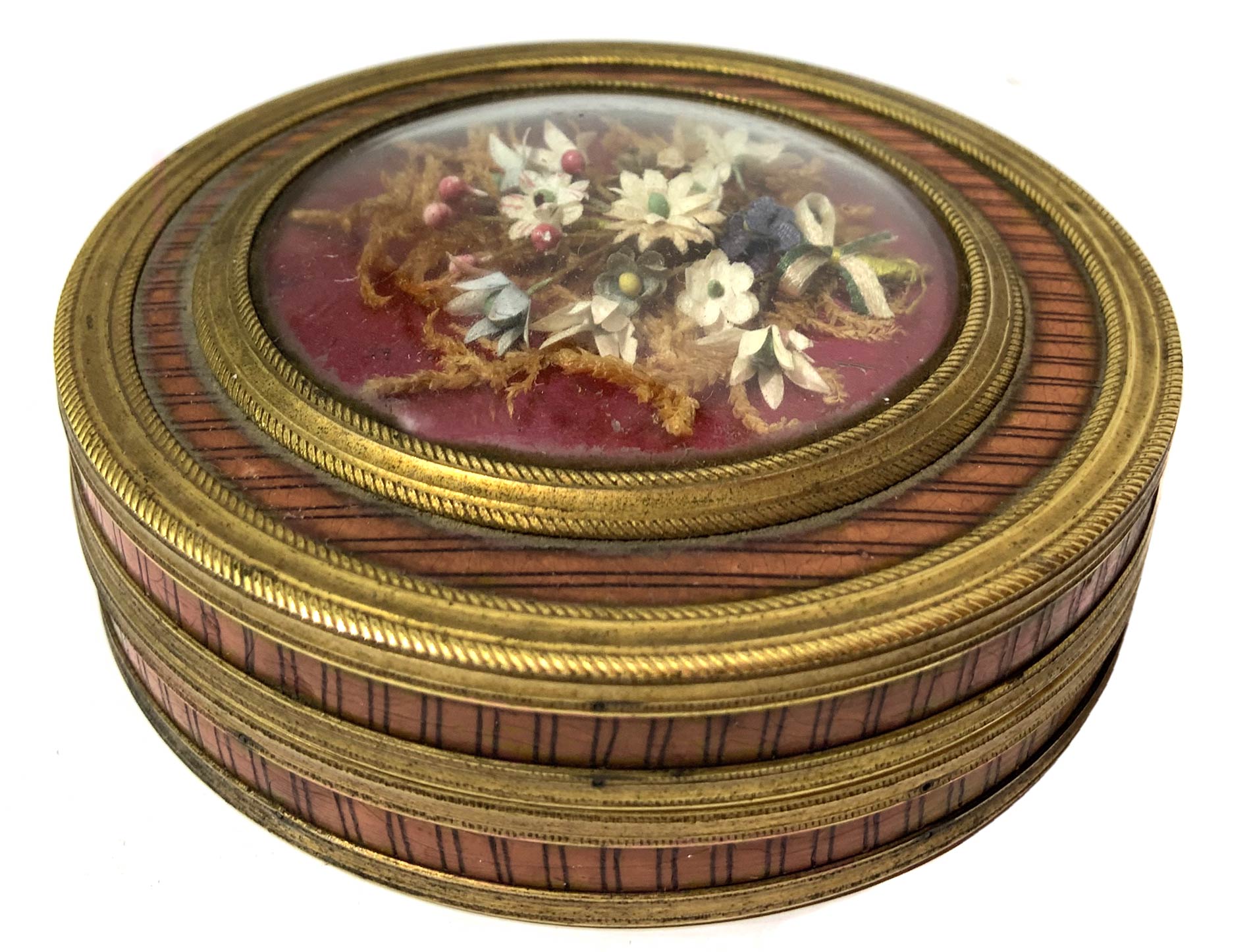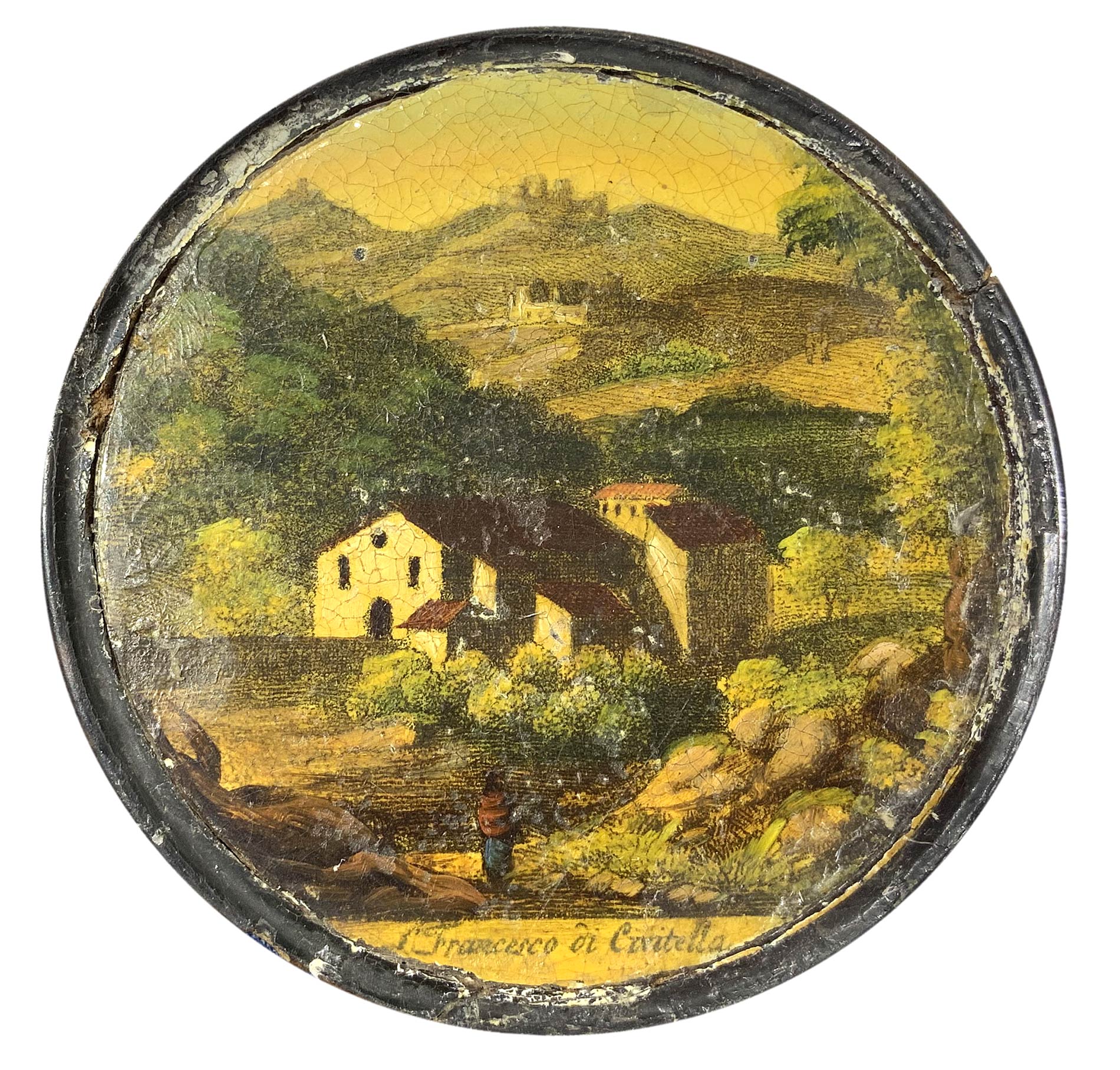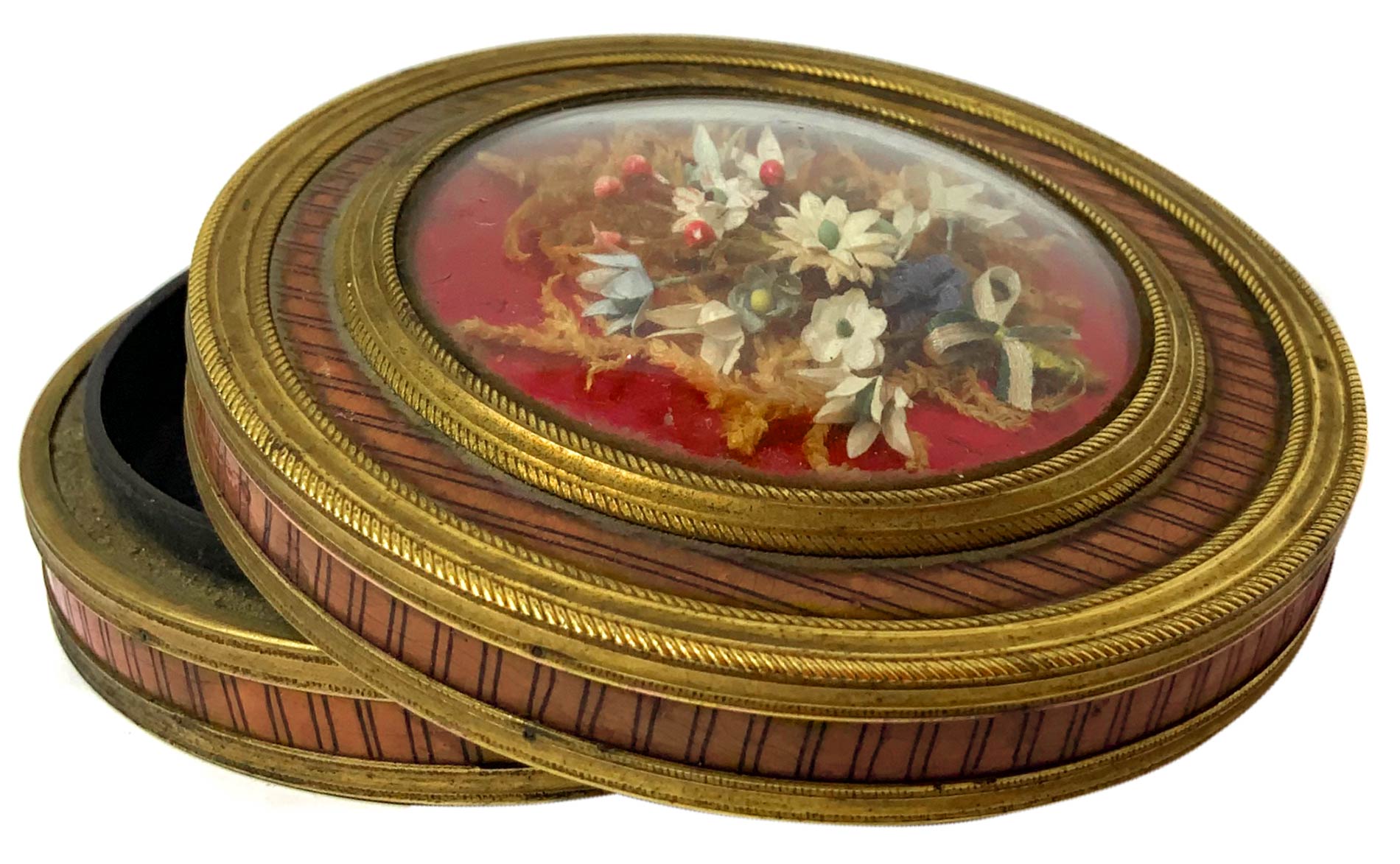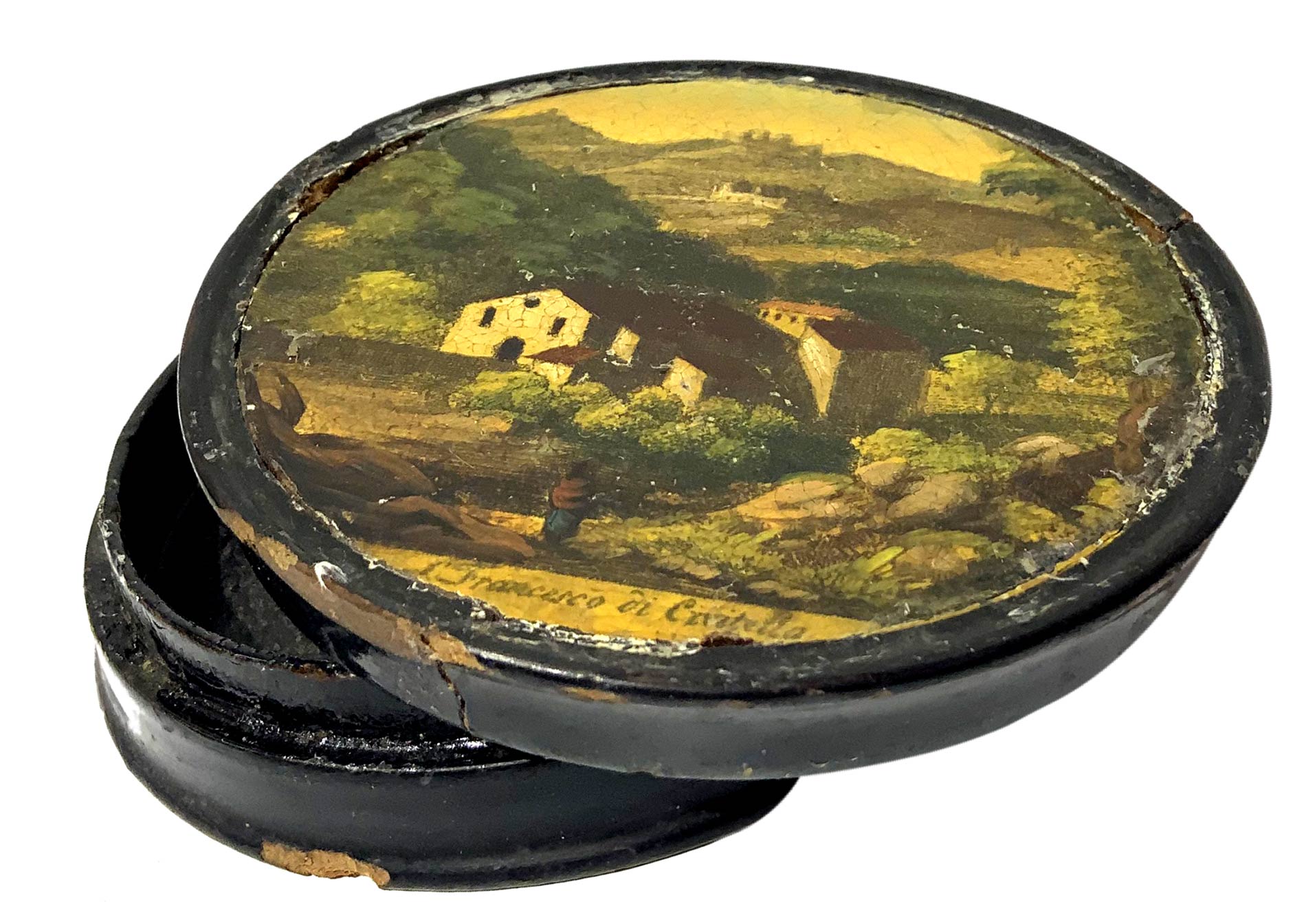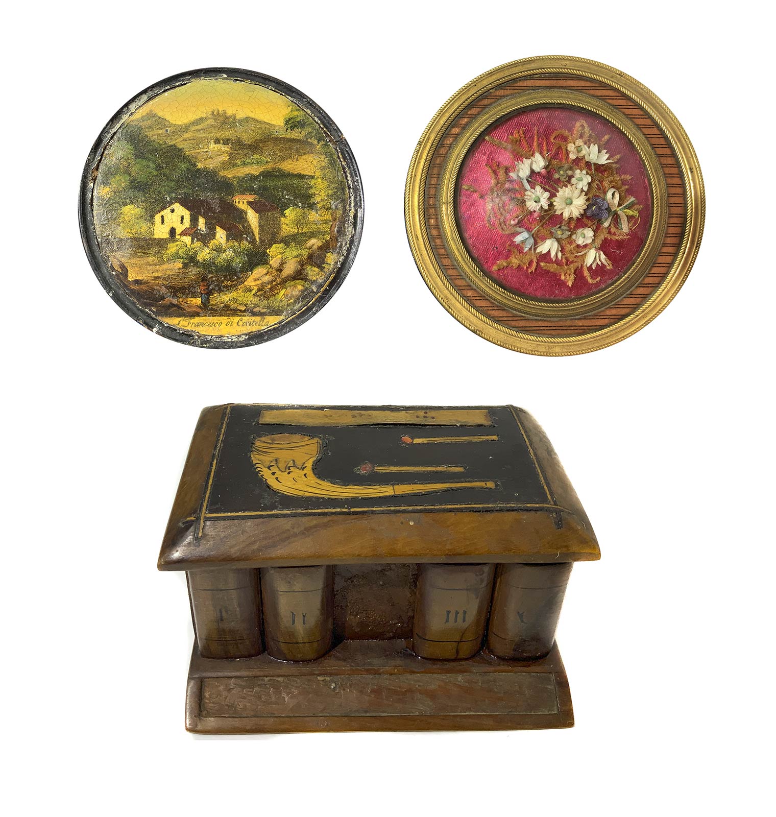 Tre tabacchiere, XX secolo. Tabacchiera colore nero con coperchio decorato con paesaggio. Firmata. Diametro cm 8,5. Tabacchiera dorata con coperchio a decori con floreali, interno in tartaruga. Diametro cm 8. Tabacchiera in legno. Cm 6x11x8.