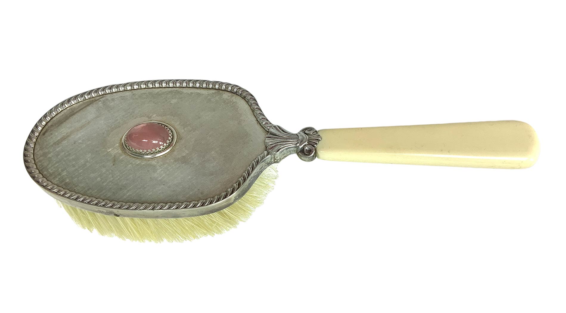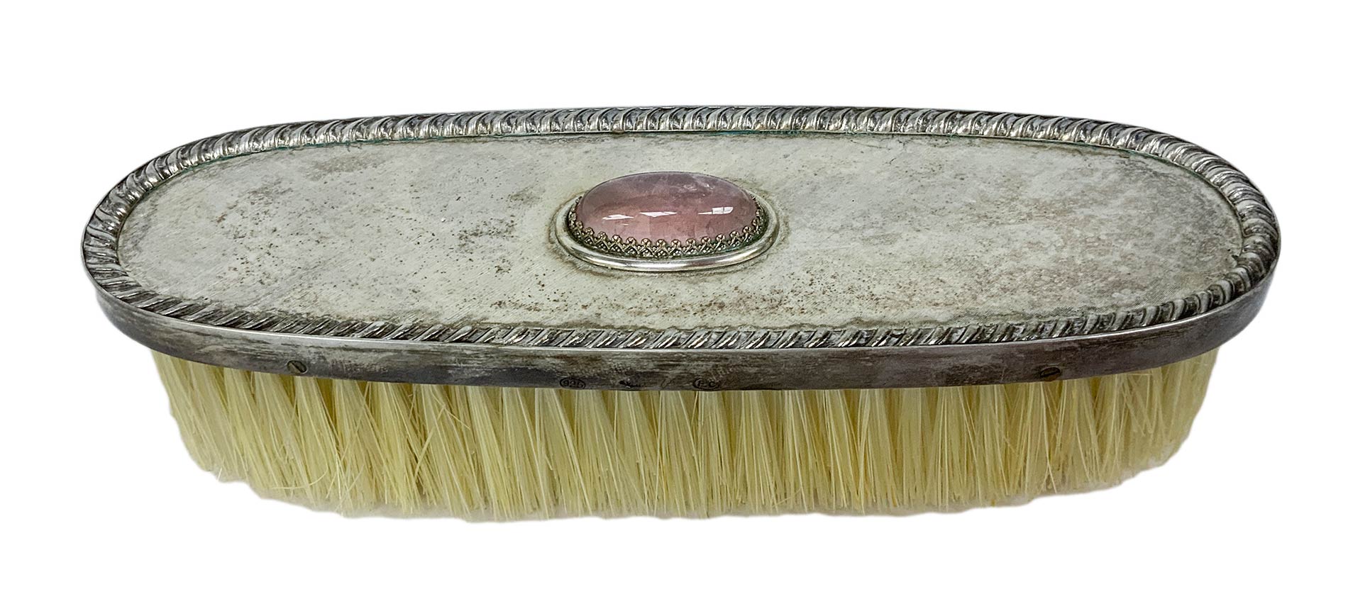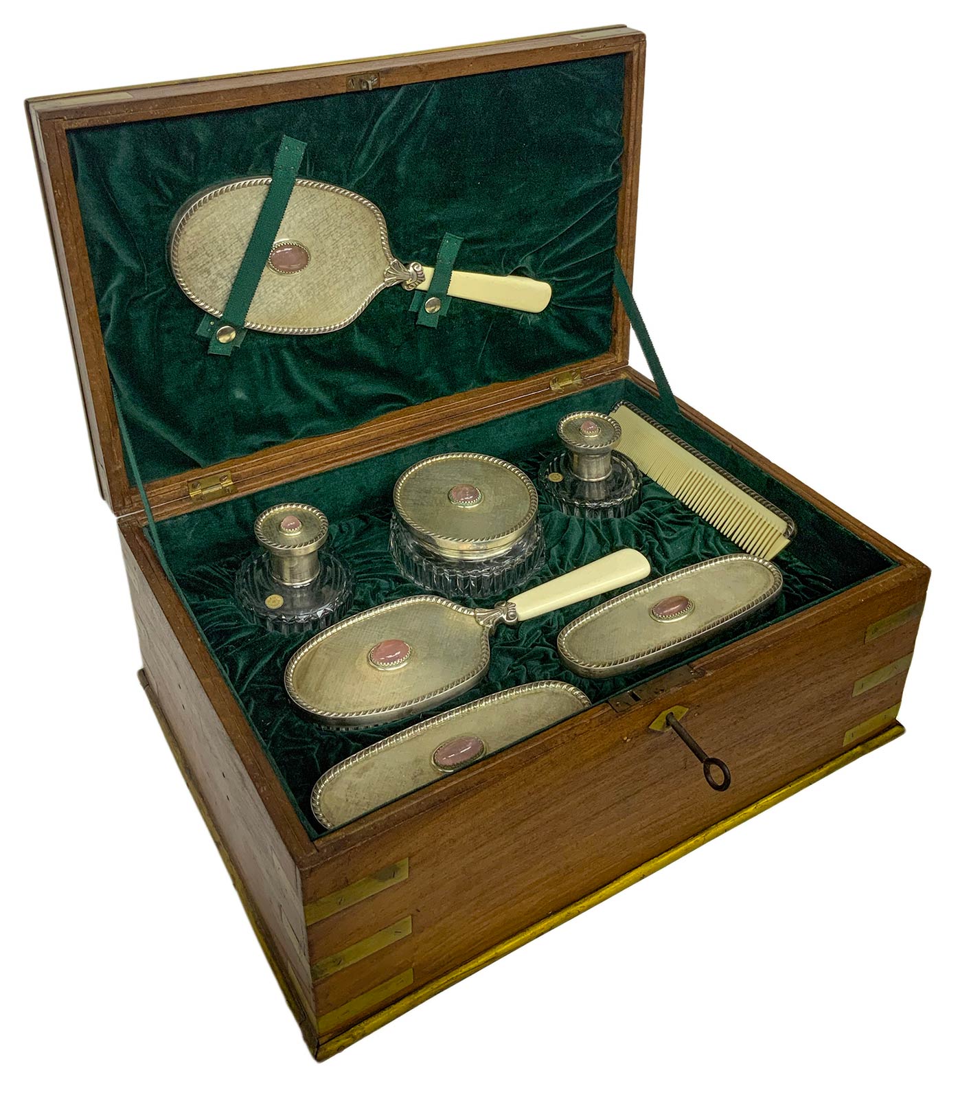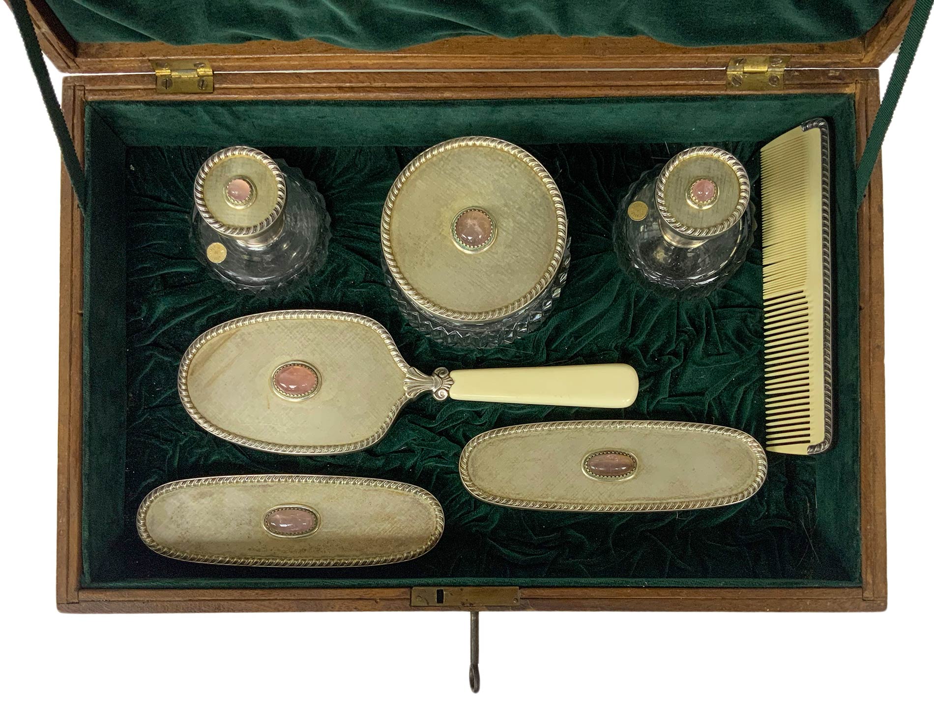 Set da toilette in argento 800. In elegante scatola di legno. Composto da 8 pezzi: 3 spazzole, 1 specchio, 1 pettine, 3 bottiglie da profumo.