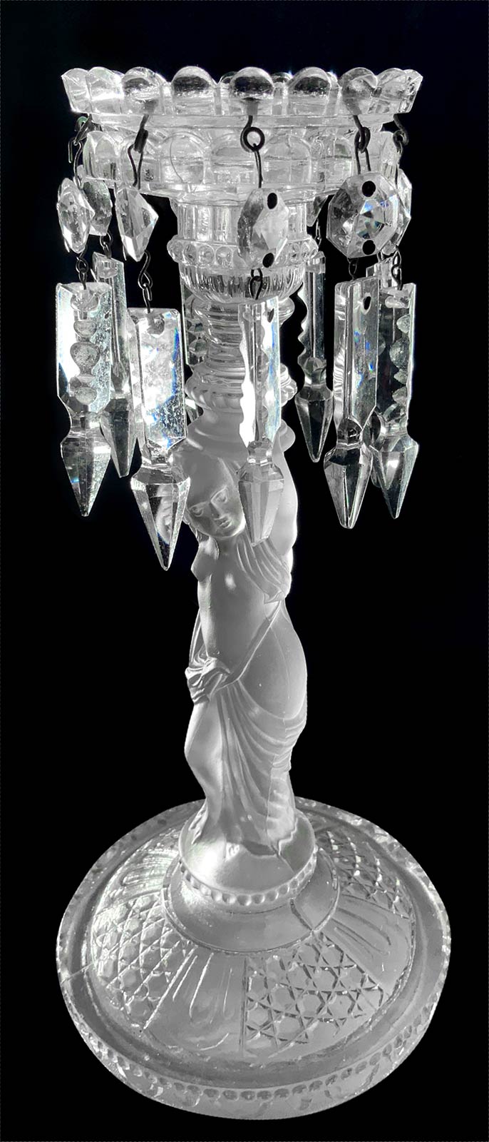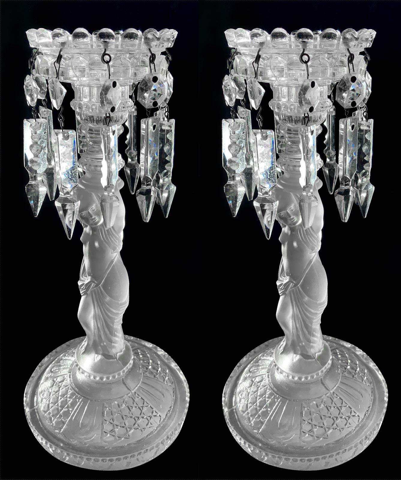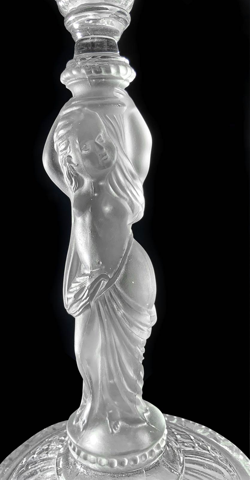 Coppia di candelieri in vetro, XIX secolo. Con brindoli Luigi Filippo e base raffigurante nudo di donna con vetro a contrasto satinato. H cm 26