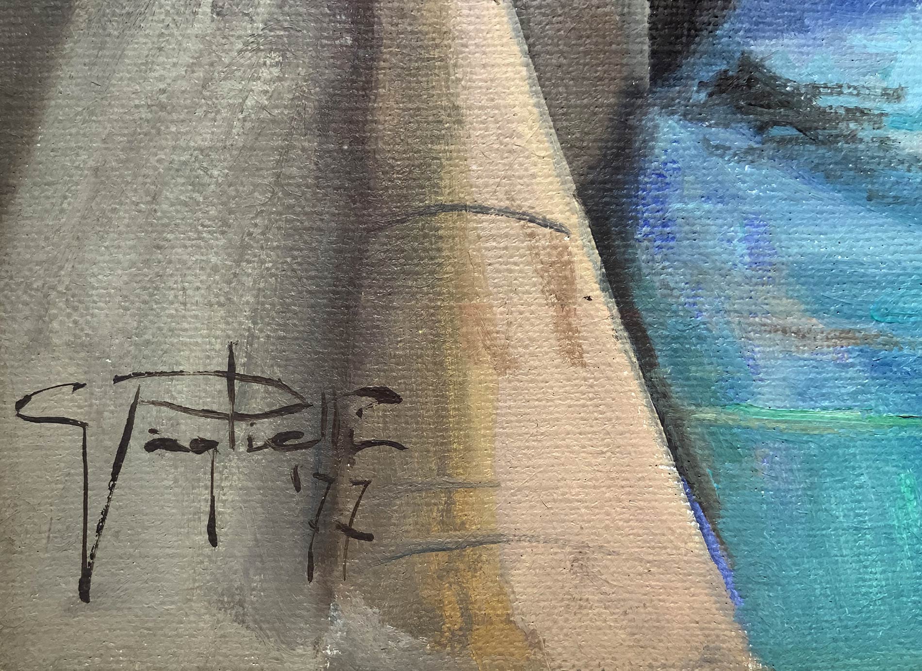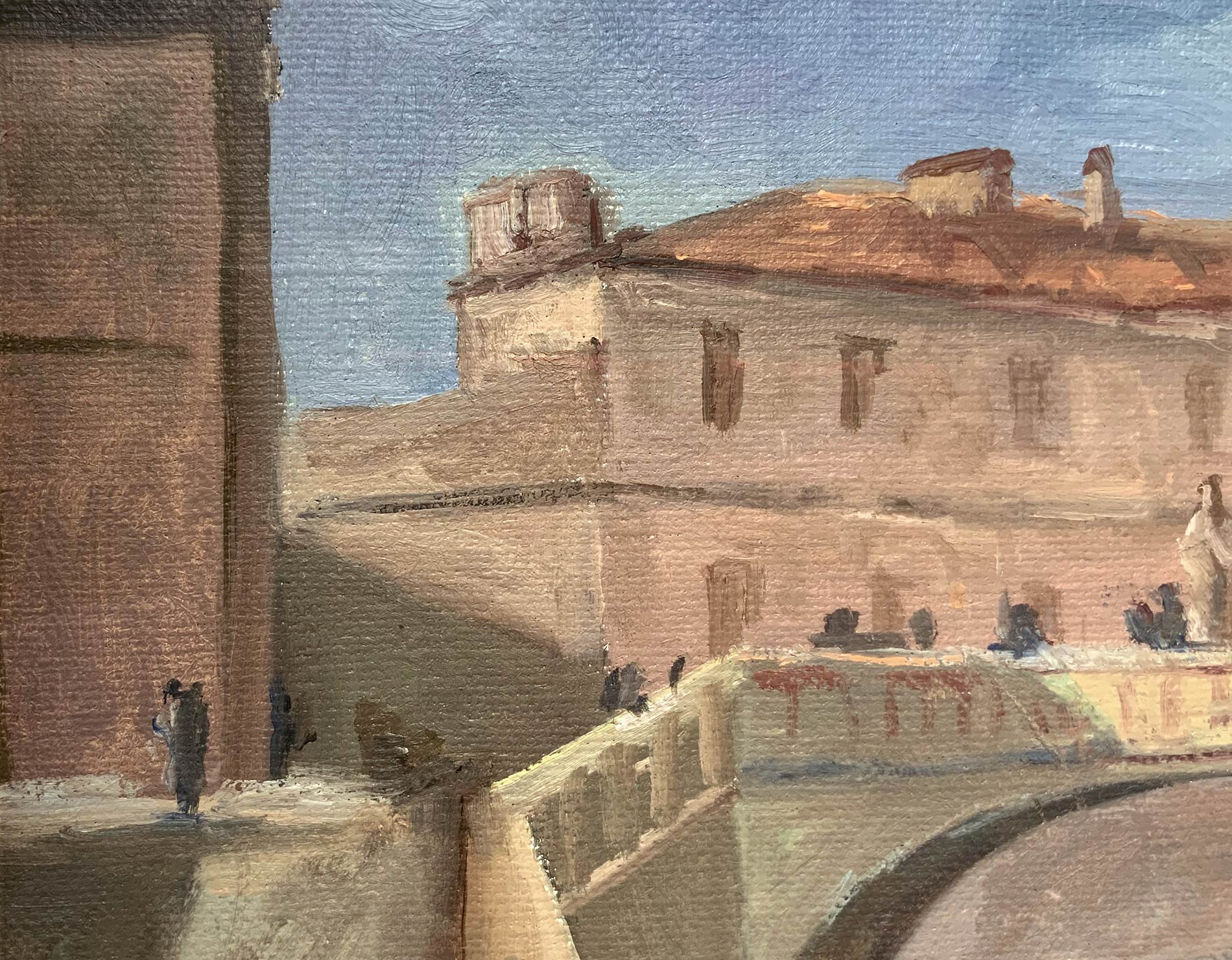 Dipinto ad olio su tela raffigurante paesaggio fluviale e ponte di porta romana degli anni ‘20, Gianni Paglietti. Cm 50x 70. Firmato e datato 77 in basso a destra.