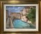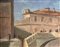 Dipinto ad olio su tela raffigurante paesaggio fluviale e ponte di porta...