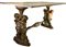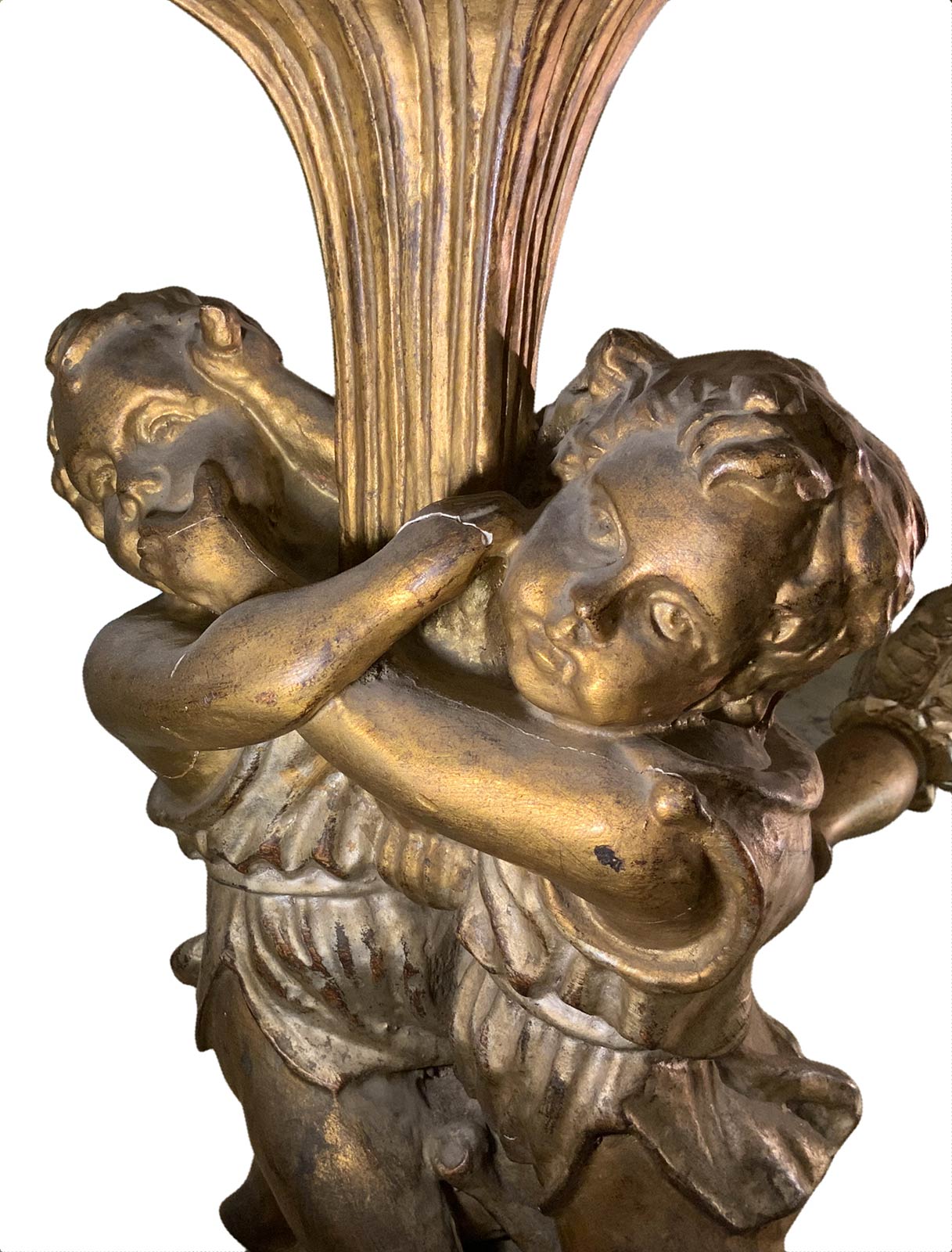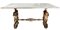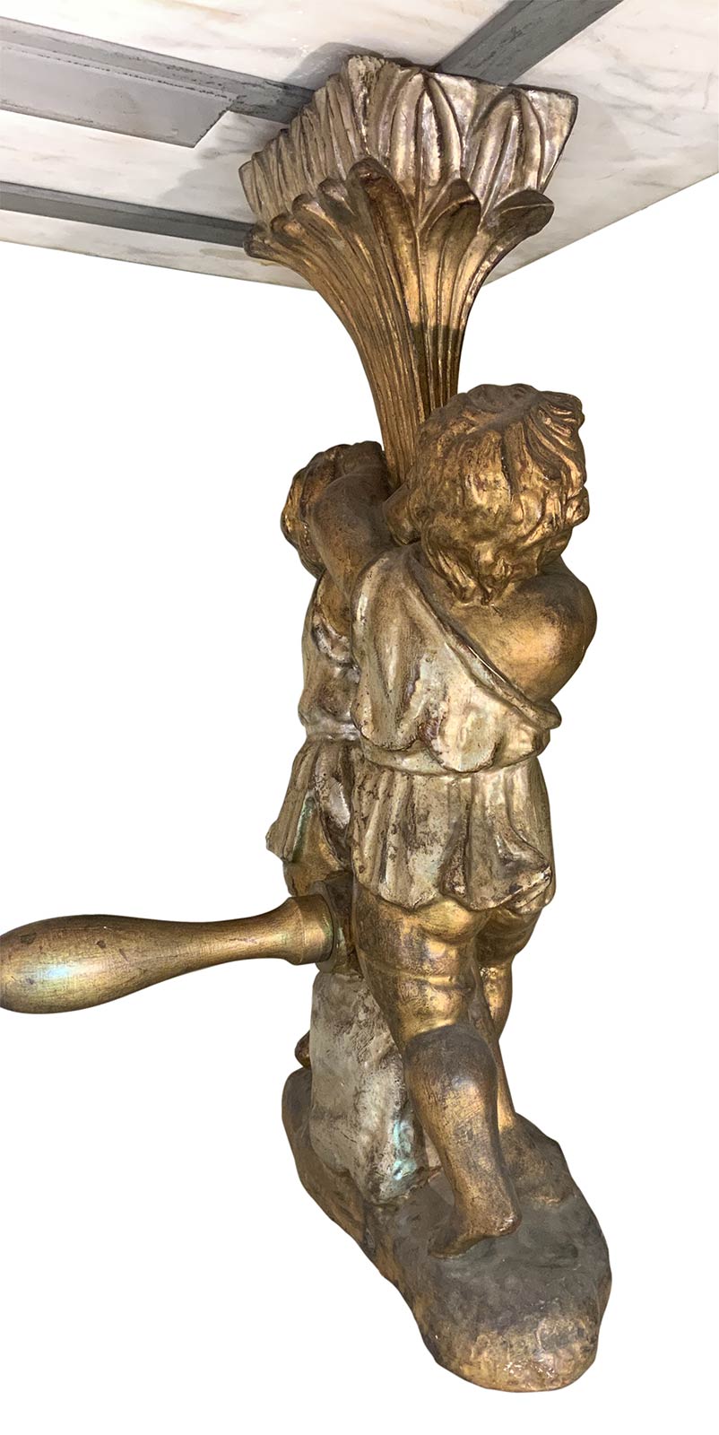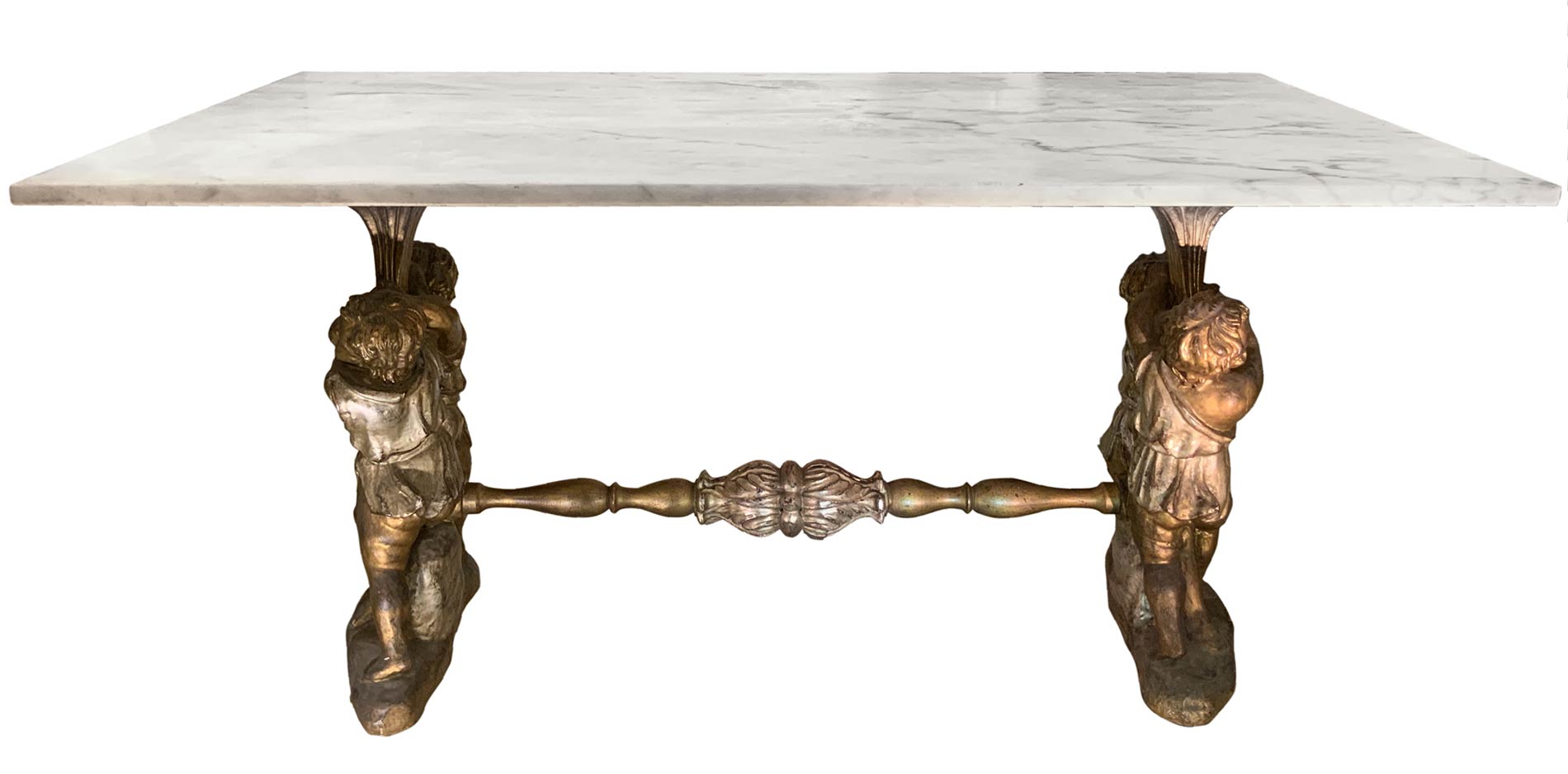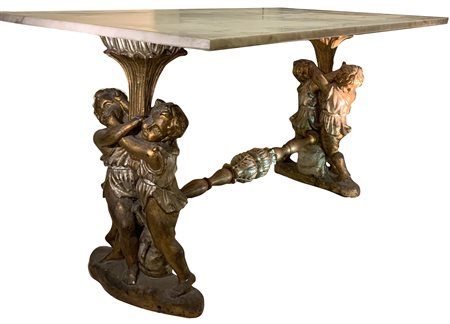 Tavolo basso, XX secolo con piano in marmo sorretto da putti. H cm 56x110x60.