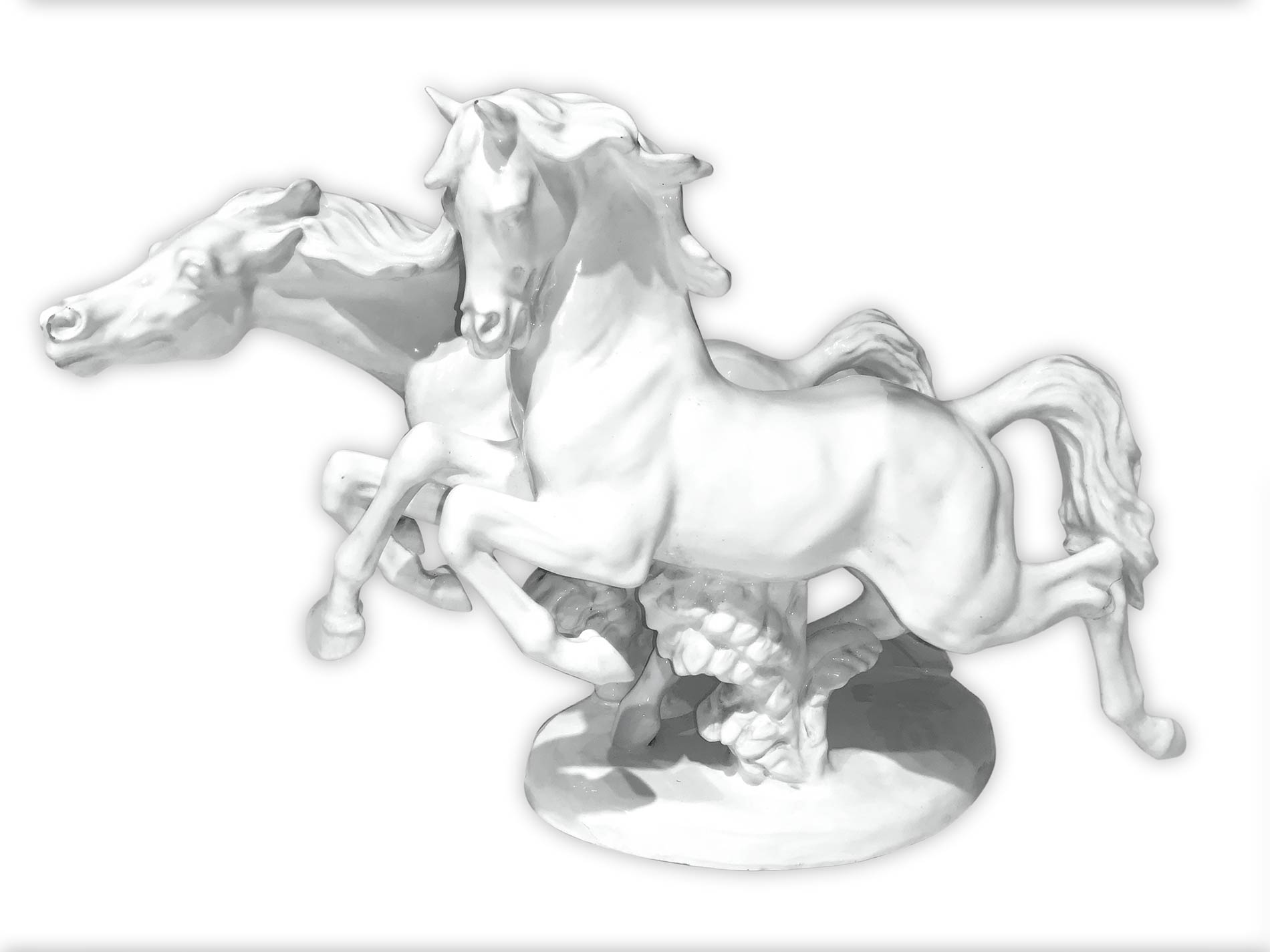 Scultura in porcellana raffigurante cavalli bianchi in corsa. Zaccagnini, XX...