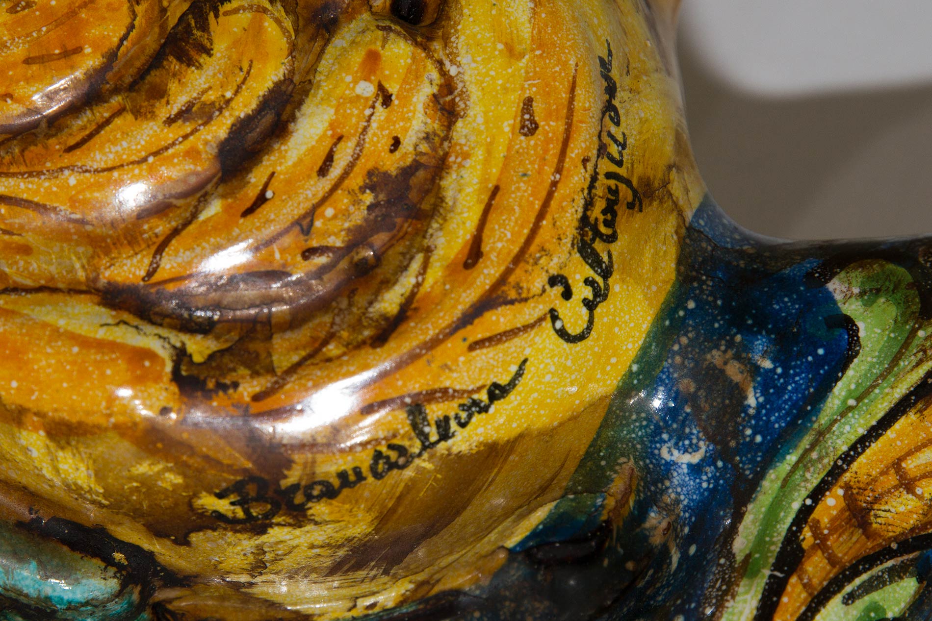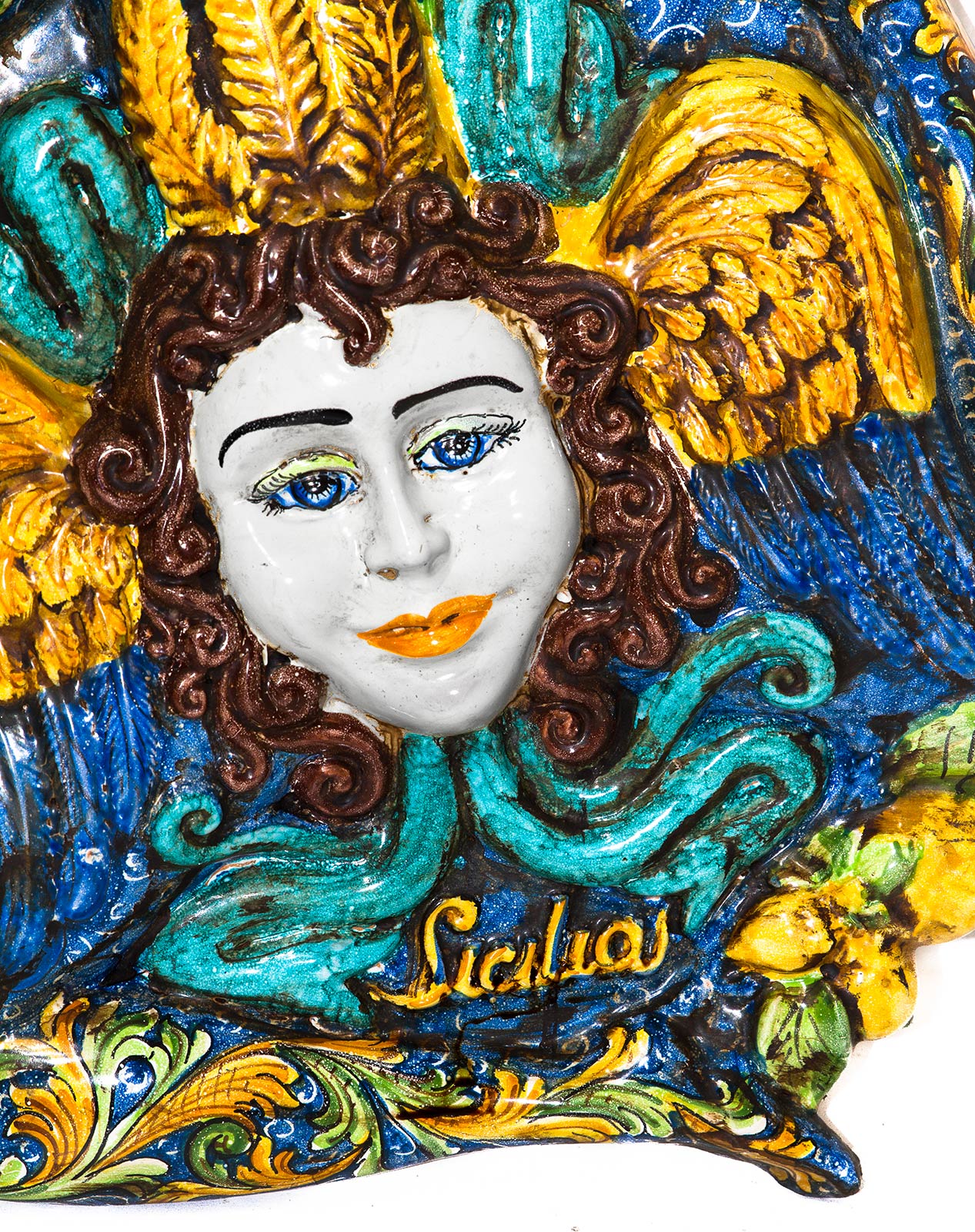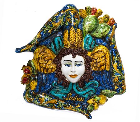 Scultura in maiolica di Caltagirone raffigurante Triscele o triskelis. Cm 60x60