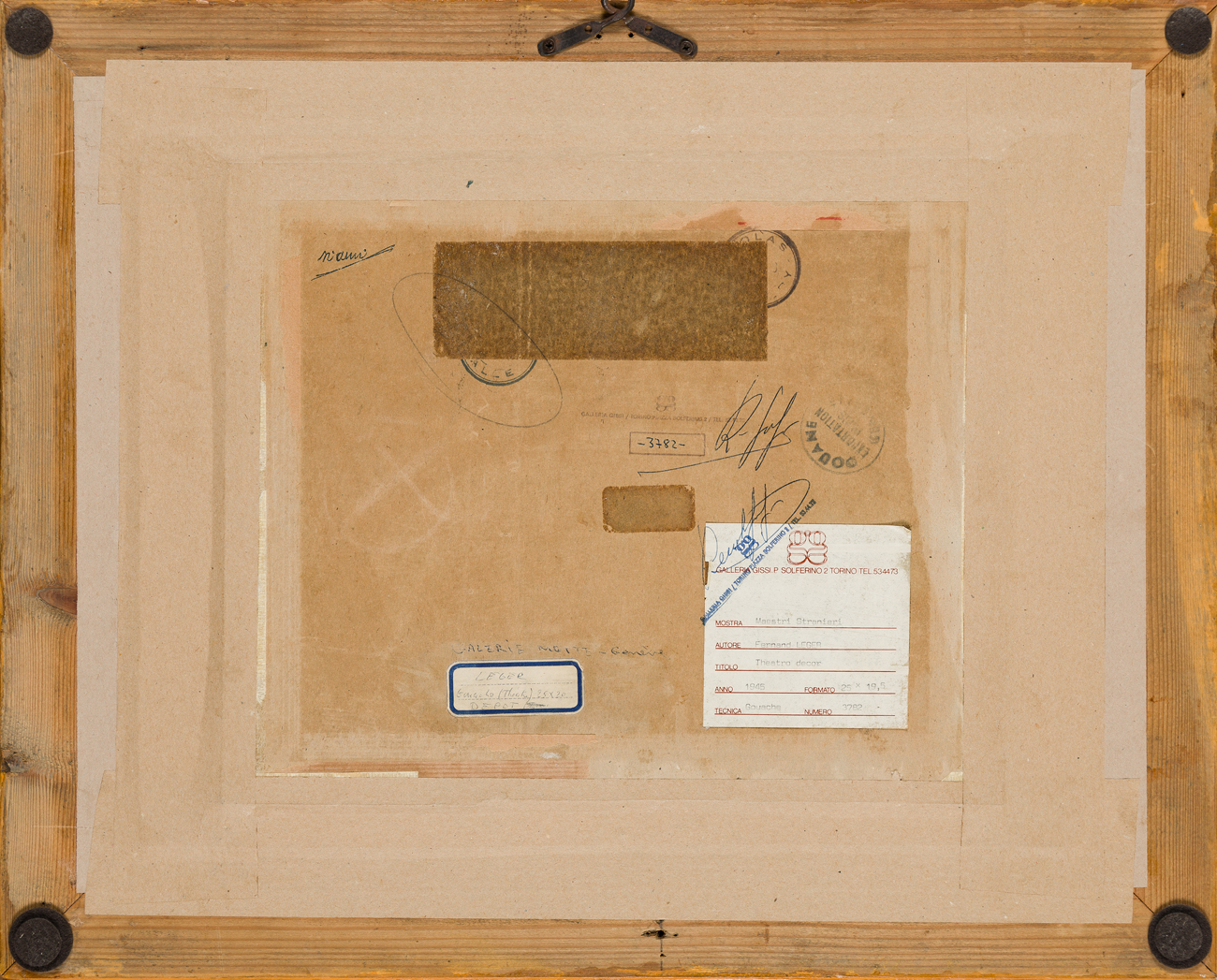 Etichetta e timbro della Galleria Gissi (TO) con numero d'inventario al retro