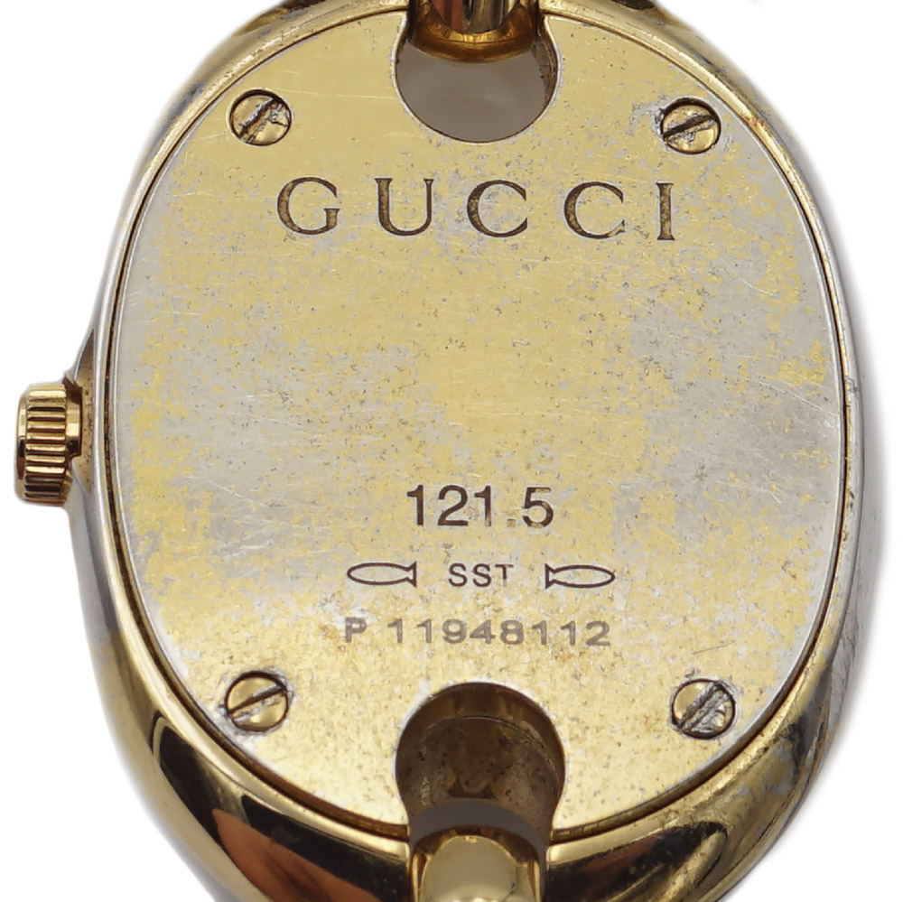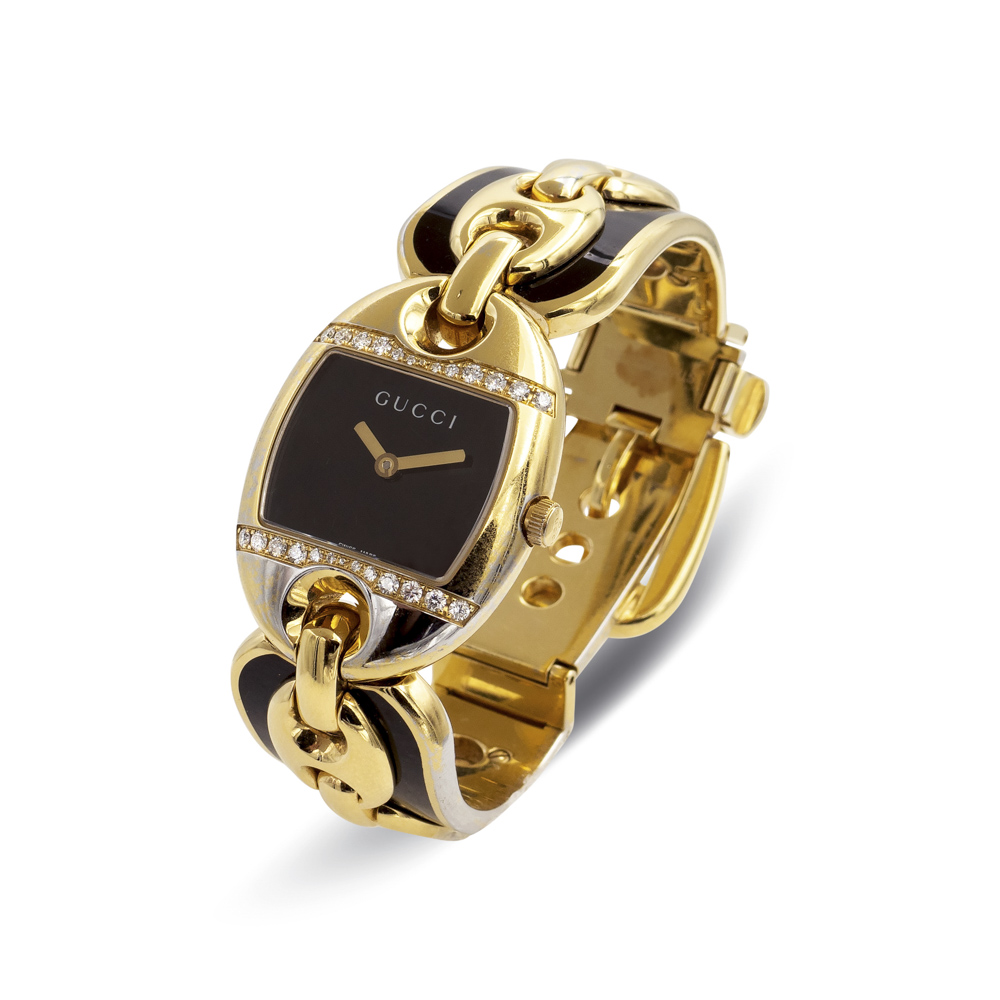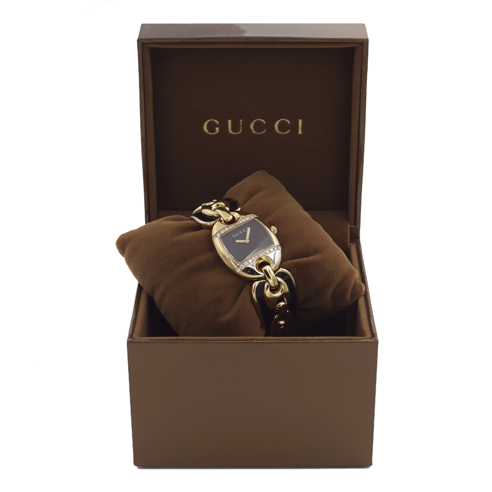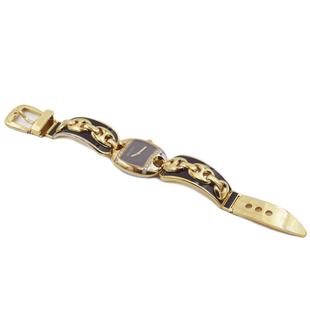 Gucci collezione "Marina" orologio da donnain metallo dorato, cassa ovale impreziosita da diamanti taglio brillante ct 0,40 circa, ref. 121.5 - P11948112 quadrante nero, movimento al quarzo, bracciale originale in metallo dorato con stesura di smalto nero e chiusura a fibbia