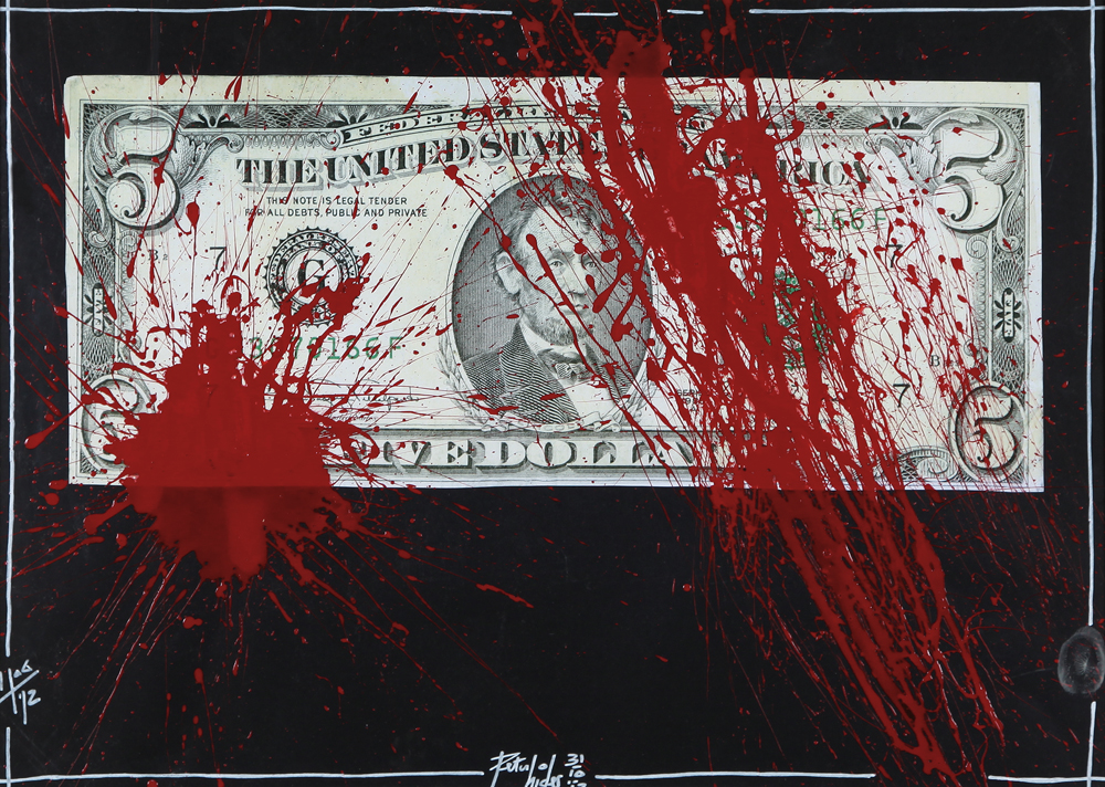 PETER HIDE Tradate (VA) 31/10/1965 Blood money, 2012 tecnica mista e collage su carta cm. 50x70, firma in basso al centro, anno in basso a sinistra.