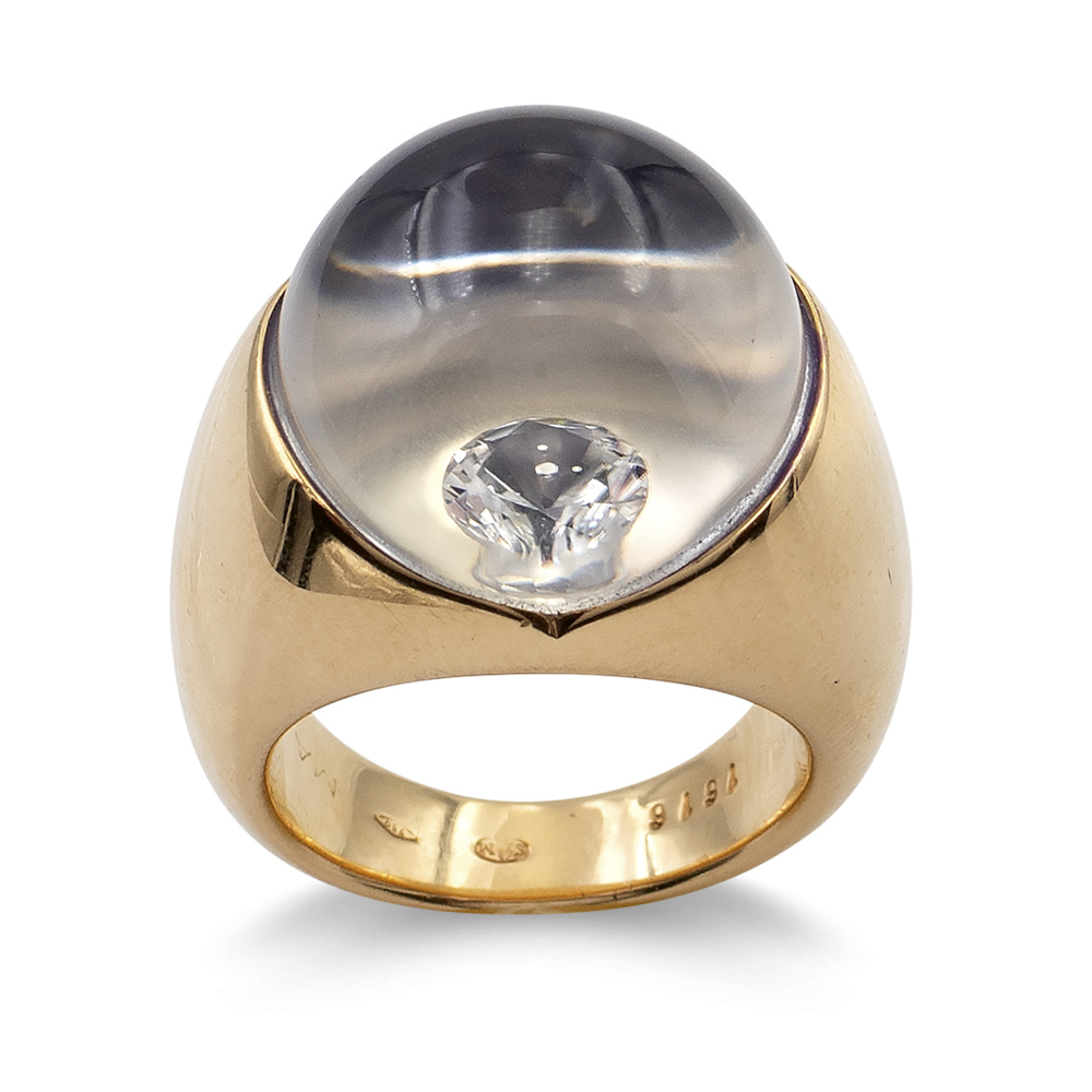 Maubussin Paris collezione "Transparence", anelloParispeso 20 gr.in oro giallo 18kt e cristallo di rocca e diamante taglio brillante all'interno ct 0,10 circa, firmato e numerato all'interno del gambo n. 1616, misura 10