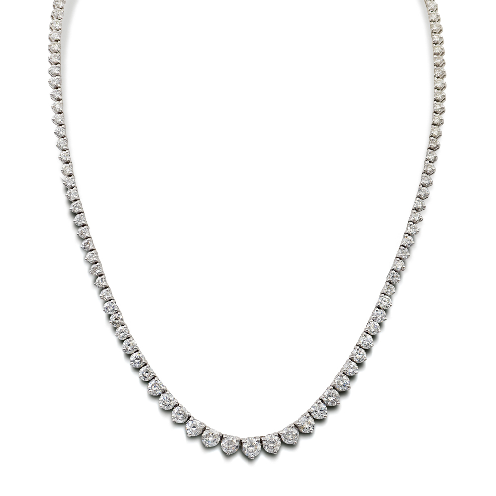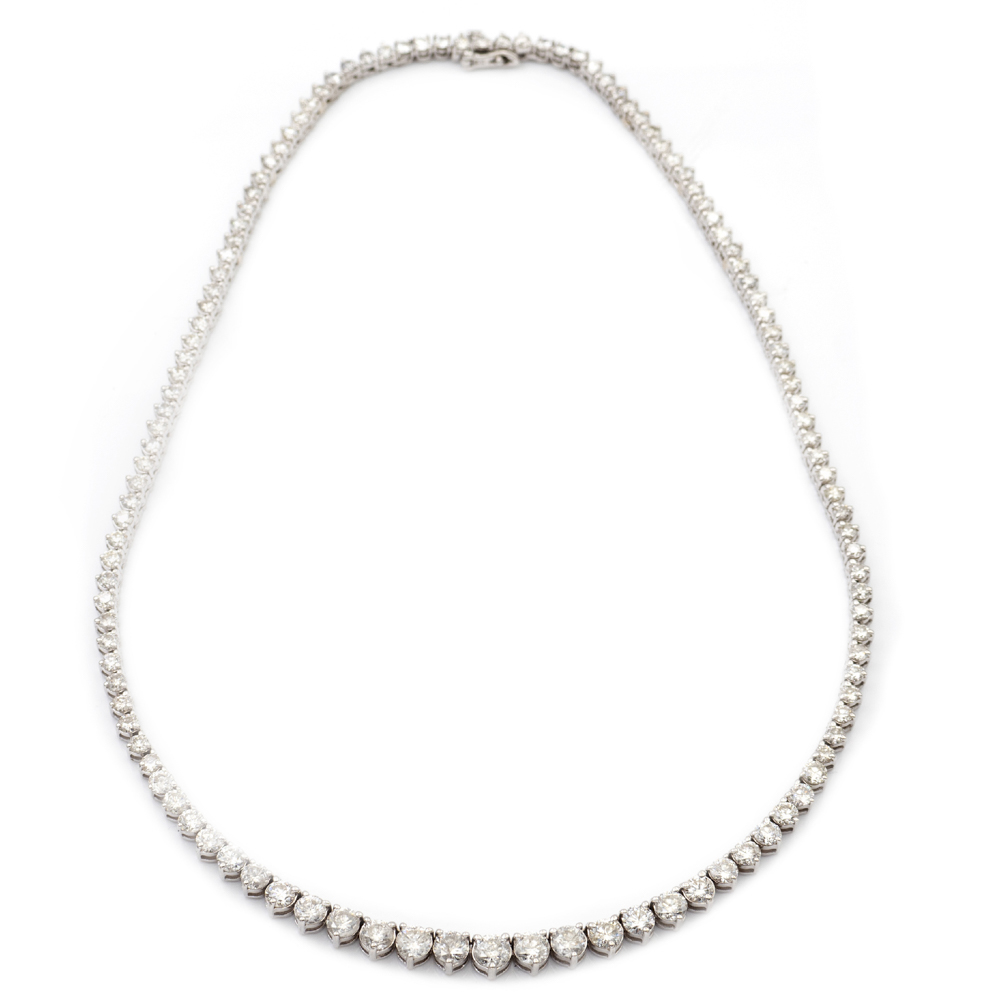 Collier riviere in oro bianco 18kt e diamantipeso 11,1 gr.taglio brillante ct 14 circa disposti a gradazione, chiusura a scomparsa, lunghezza 43 cm.