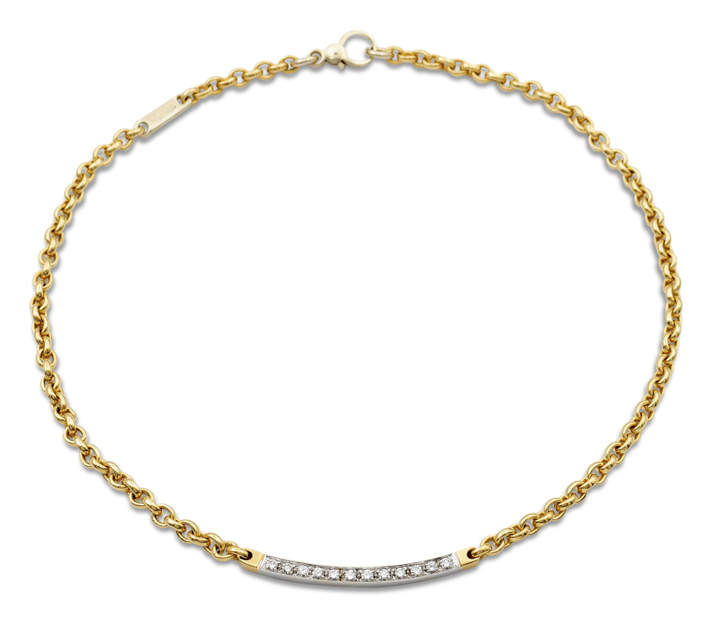 Pomellato, collana in oro giallo 18ktpeso 38,4 gr.maglie incrociate, centrale realizzato in oro bianco e giallo con diamanti taglio brillante ct 0,30 circa, lunghezza 41 cm.