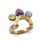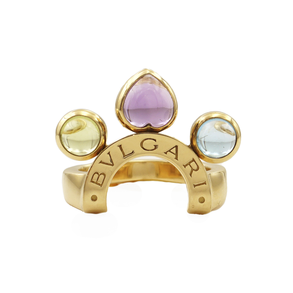 Bulgari collezione "Allegra", anellopeso 9,2 gr.in oro giallo 18kt con elementi mobili realizzati in oro con acquamarina e peridoto taglio cabochon, al centro ametista taglio a cuore, firmato all'interno del gambo, misura 11