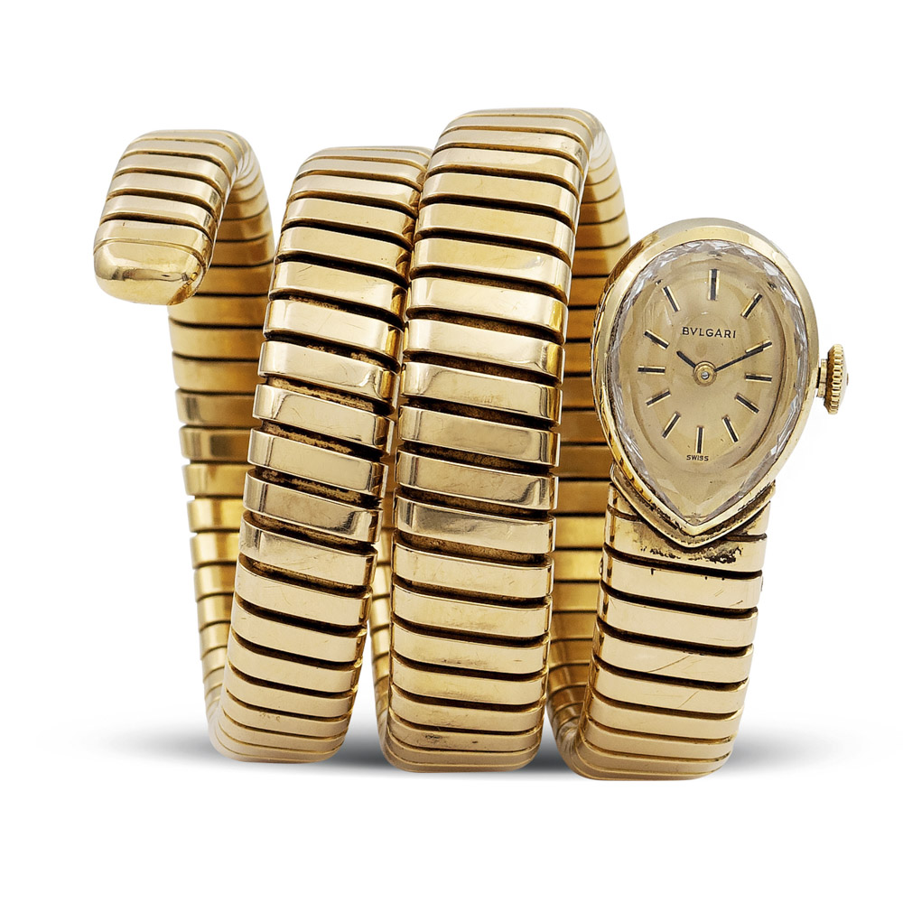 Bulgari, bracciale orologio a serpenteanni 60/70peso 97,7 gr.in oro giallo 18kt, cassa 19x14 mm. ref. 899350 quadrante dorato con indici, movimento meccanico a carica manuale, bracciale maglia tubogas a tre spirali in oro giallo firmato all'interno
