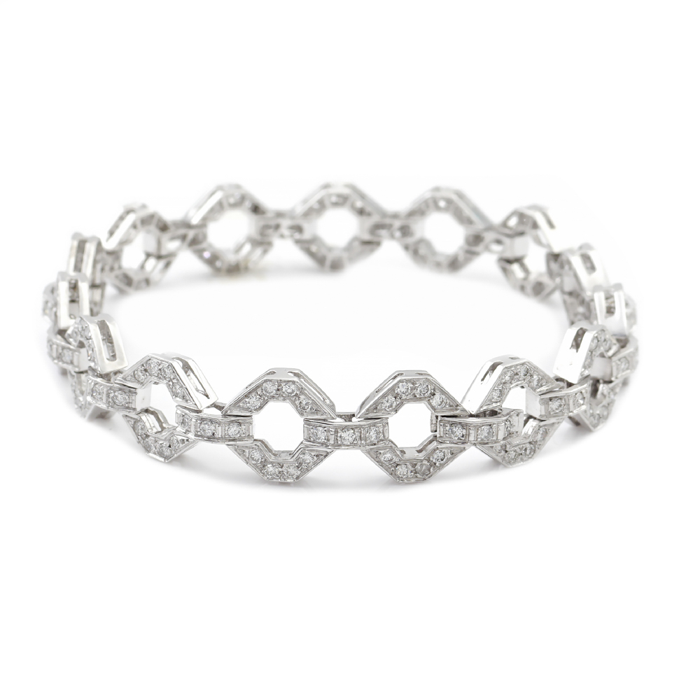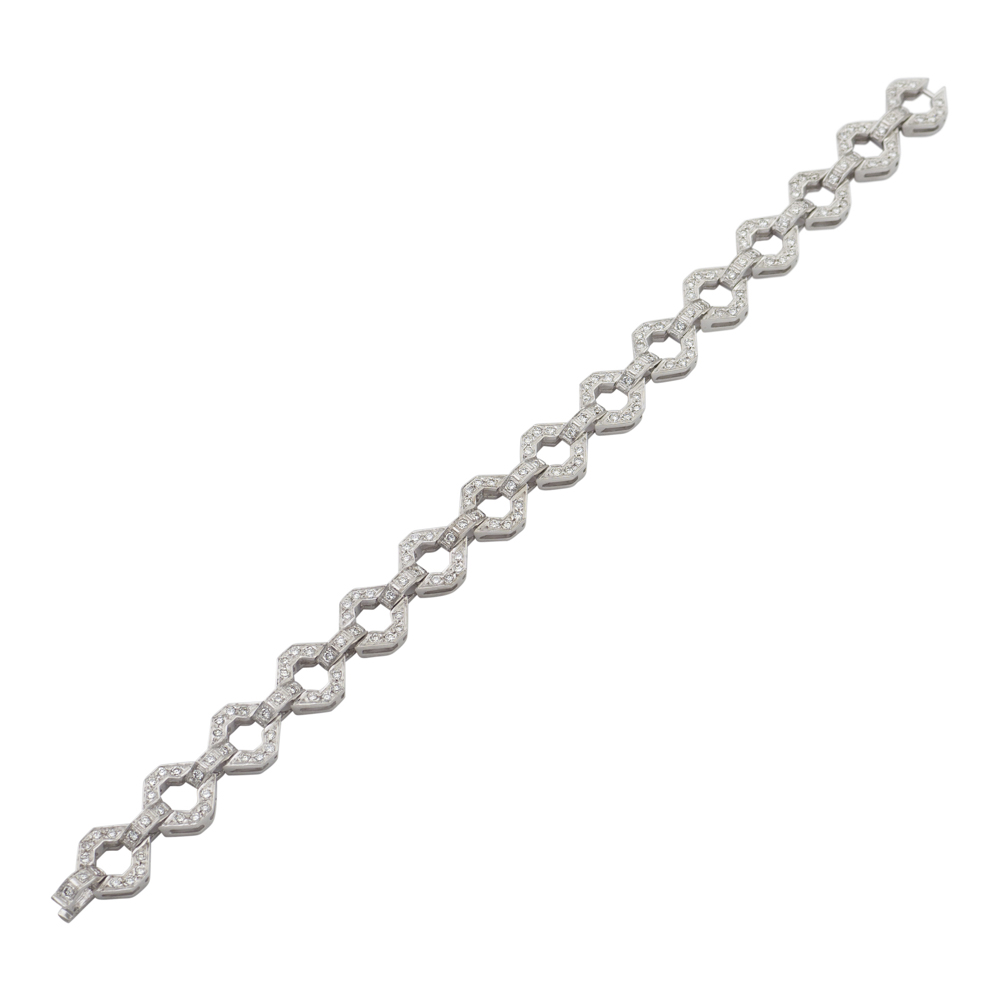 Bracciale a motivo geometrico in oro bianco 18kt e diamantipeso 25,4 gr.taglio brillante ct 4 circa, chiusura a scomparsa, lunghezza 19 cm.