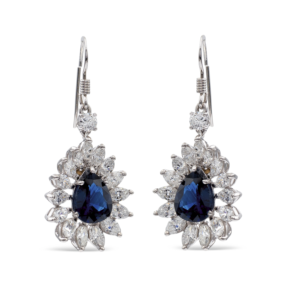 Petochi, orecchini pendenti in oro bianco 18ktpeso 13 gr.due zaffiri a goccia ct 5,60 circa contornati da diamanti taglio marquise e due diamanti taglio brillante ct 4 circa, firmati sul retro