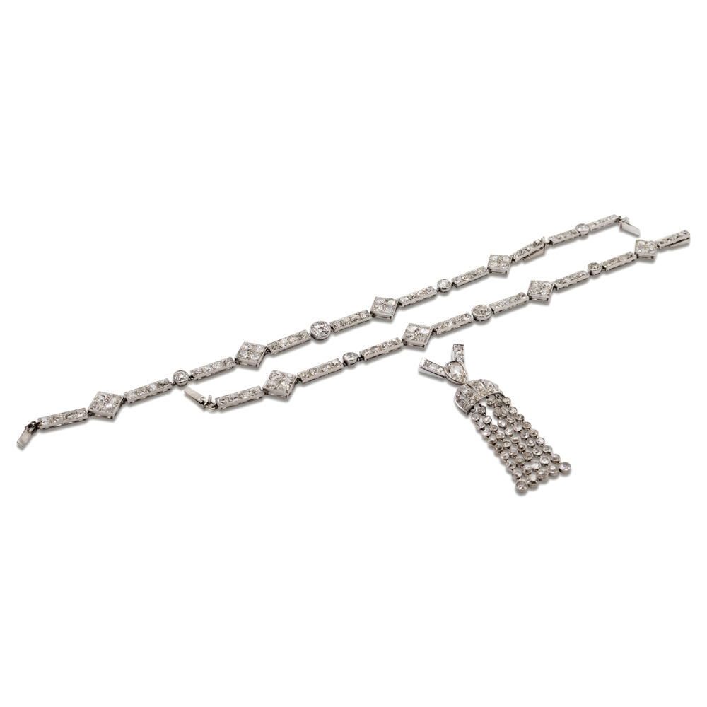 Collana Art Decò in platino e diamantipeso 42,9 gr.taglio brillante antico ct 11 circa con pendente removibile centrato da un diamante taglio a goccia e nappine con diamanti taglio brillante, la collana si può trasformare in bracciale, chiusure a scomparsa, lunghezza: collana 42 cm., bracciale 18 cm.