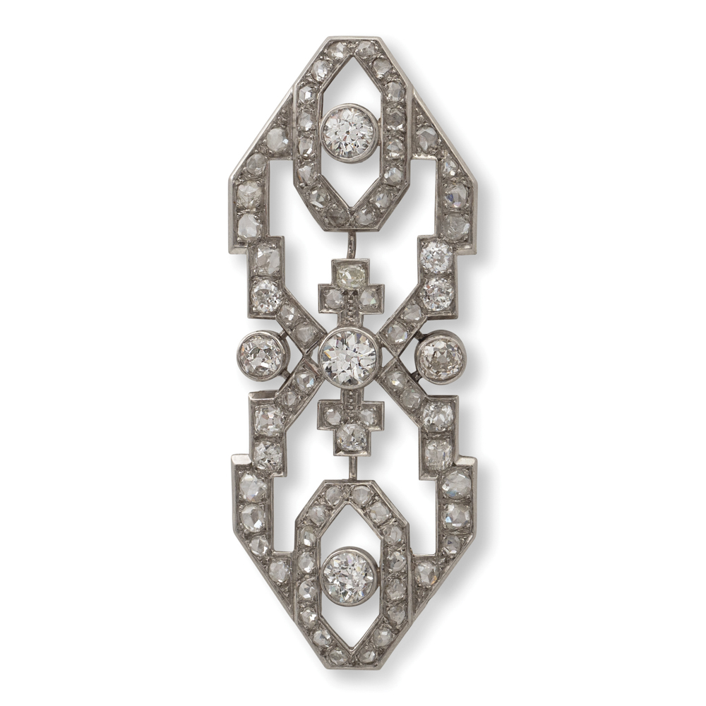 Spilla pendente a motivo geometrico in platino e diamantiArt Decòpeso 12,3 gr.cinque diamanti taglio brillante antico ct 1,50 circa contornati da rose di diamante ct 2 circa