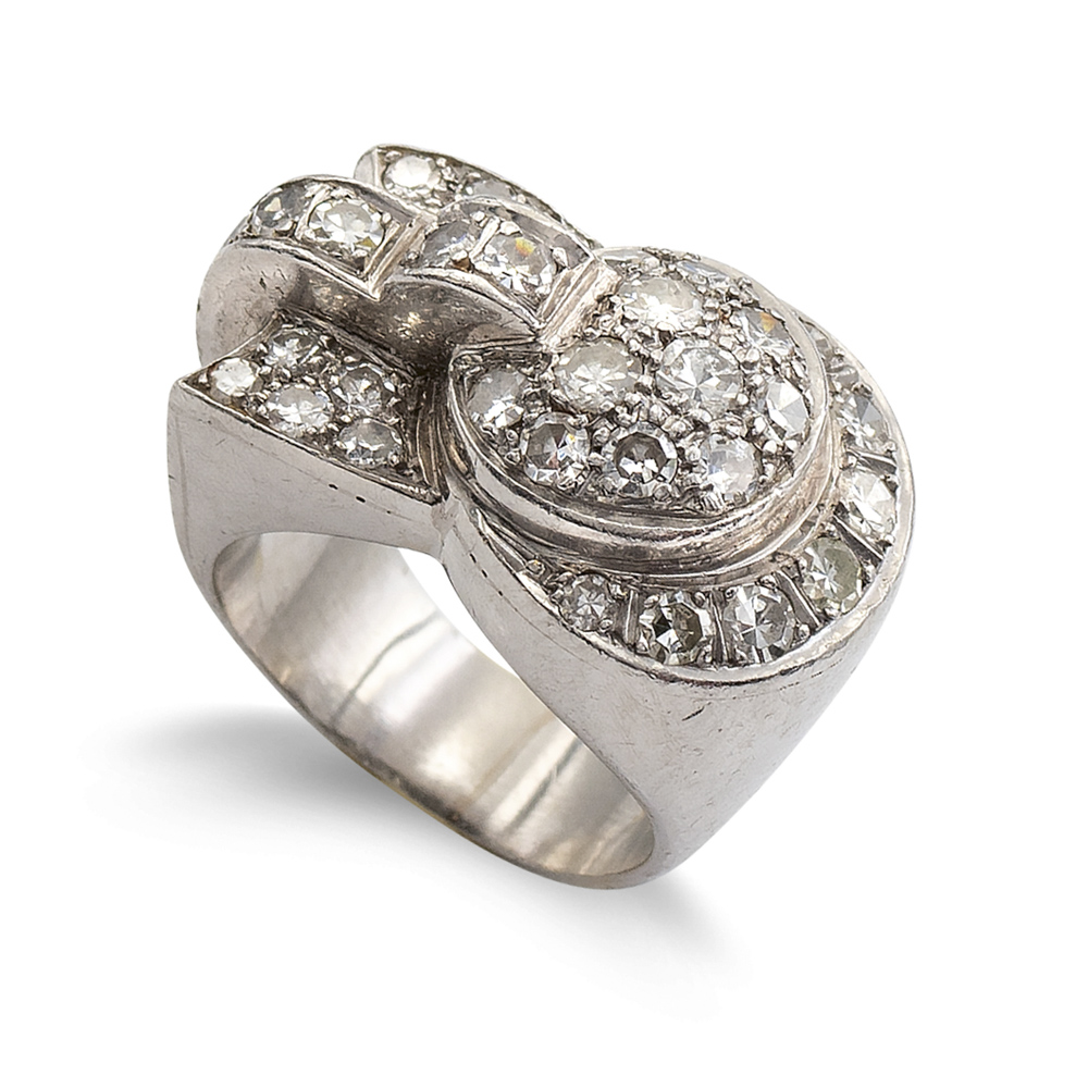 Anello a ponte in platino e diamantianni 40/50peso 12,7 gr.taglio brillante ct 1,20 circa, misura 7