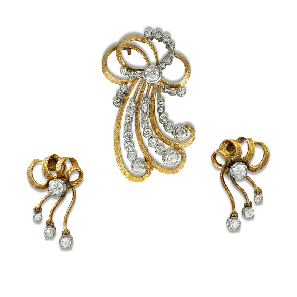 Parure in oro giallo e bianco 18kt e diamantianni 40/50peso 33,5 gr.composta da spilla e orecchini en suite realizzata in oro con incastonati diamanti taglio brillante vecchio ct 4,50 circa