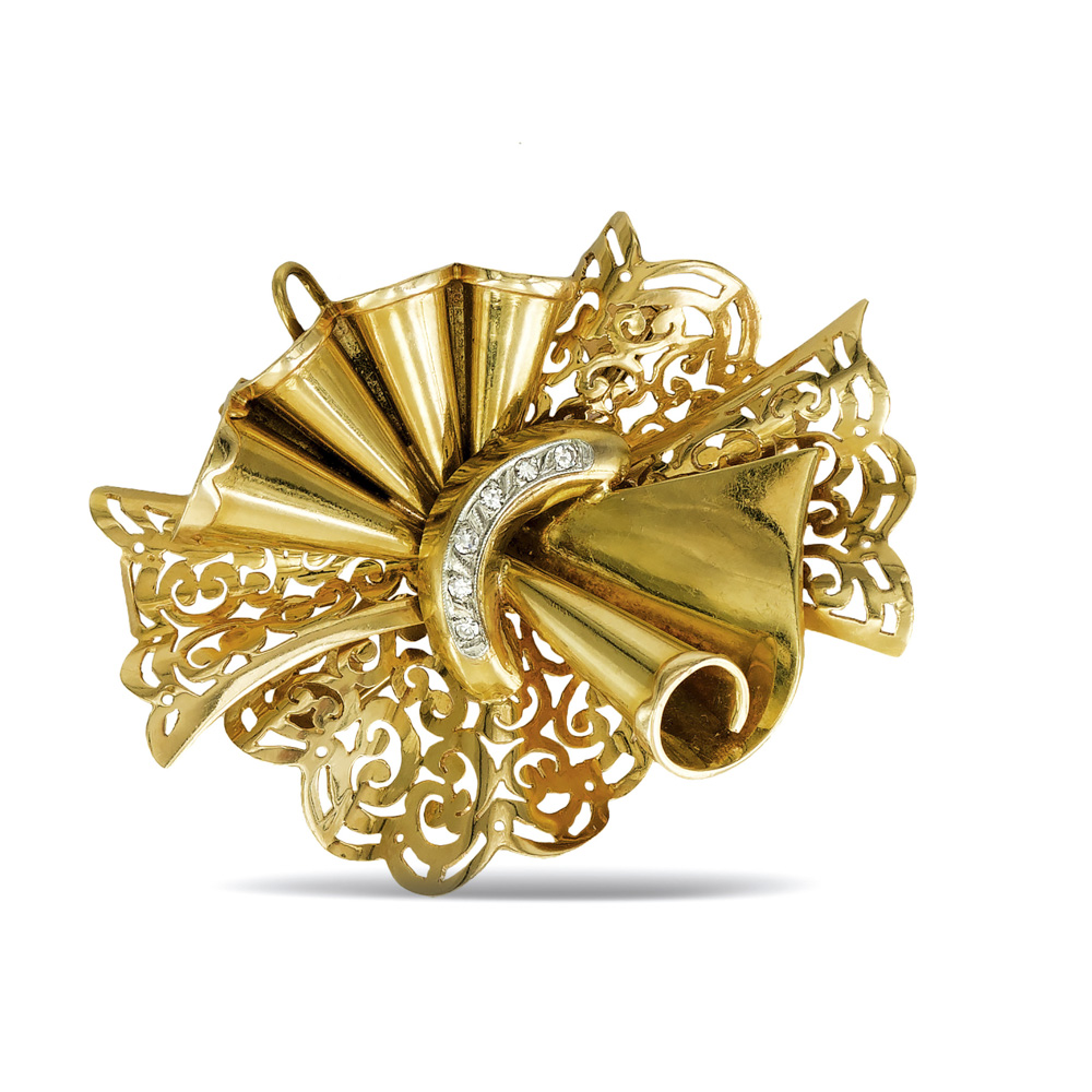 Spilla pendente a fiocco in oro giallo 18ktanni 40/50peso 20,3 gr.centrata da una riviere di diamanti taglio brillante montati su oro bianco