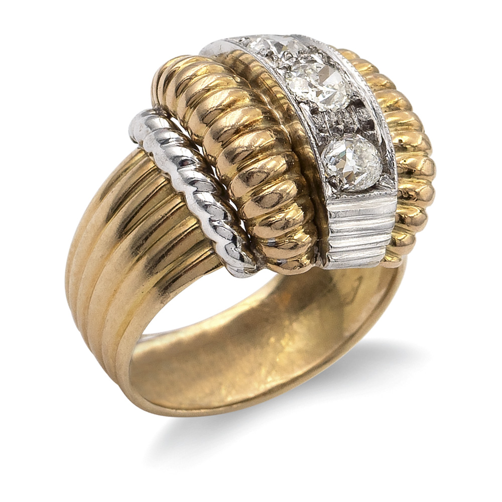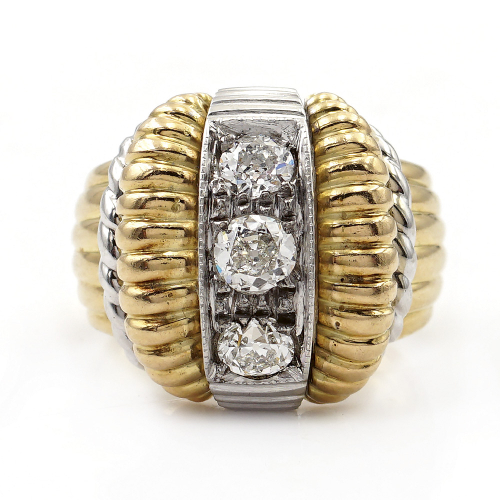 Anello a ponte in oro giallo e bianco 18ktanni 40/50peso 15 gr.tre diamanti taglio brillante antico ct 1 circa, misura 15