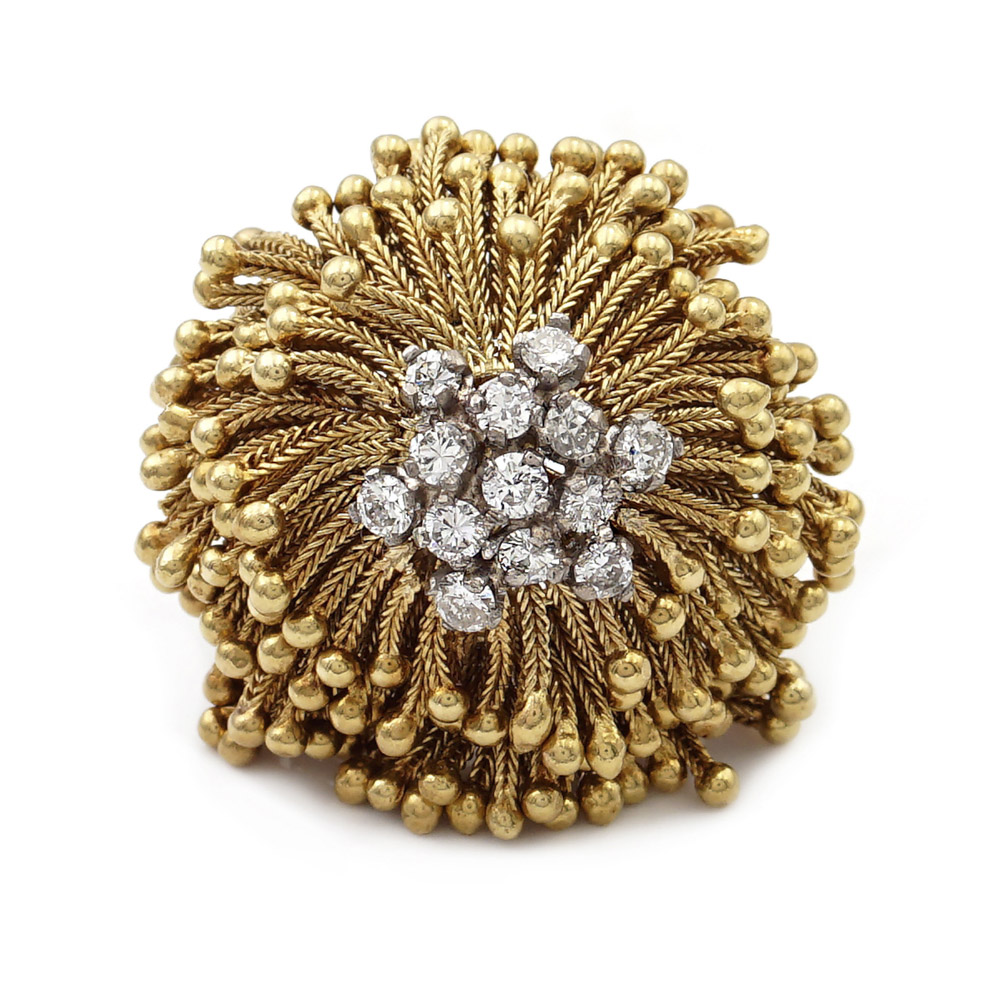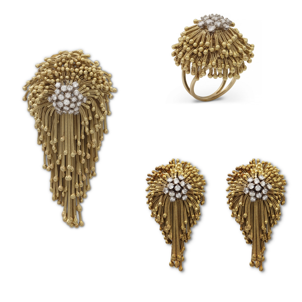 Parure frange in oro giallo 18kt e diamantianni 40/50peso 114 gr.taglio brillante ct 2,50 circa composta da una spilla, orecchini e anello en suite misura 8