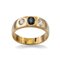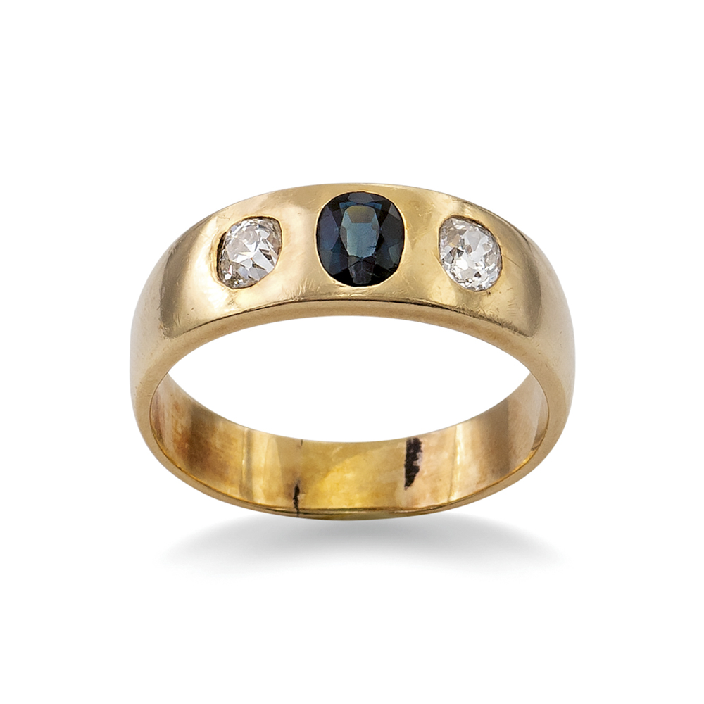 Anello uomo in oro giallo 18ktanni 40/50peso 11 gr.zaffiro ovale centrale e ai lati due diamanti taglio brillante antico ct 0,50 circa, misura 30
