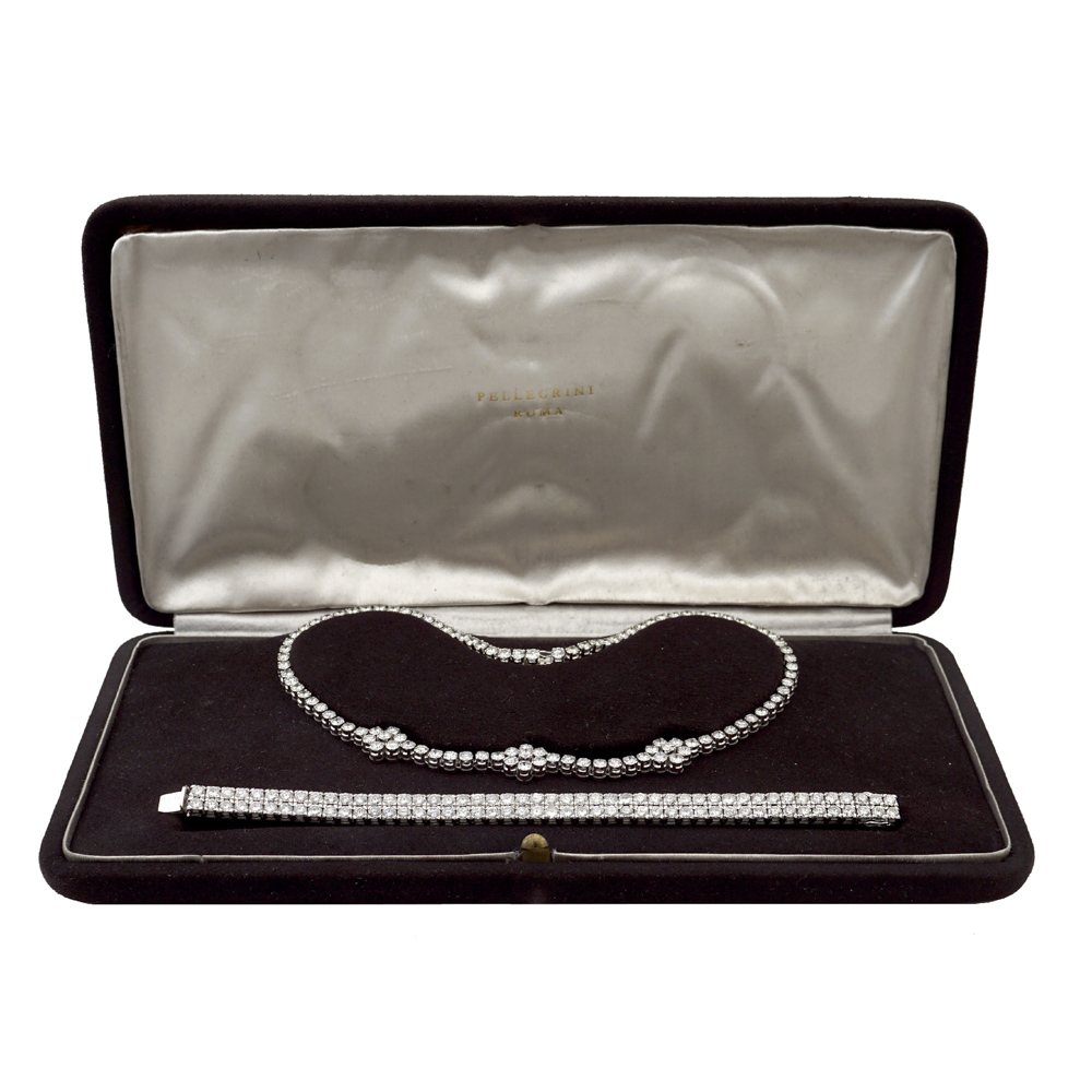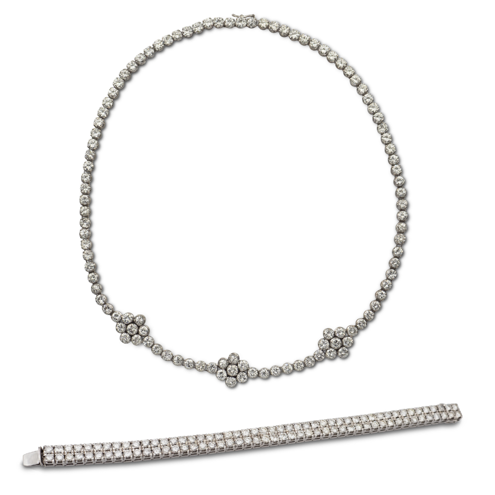ct 30 circa composta da un collier a motivo floreale ed un bracciale tennis a doppia riviere, lunghezza 37 e 17,5 cm.