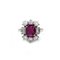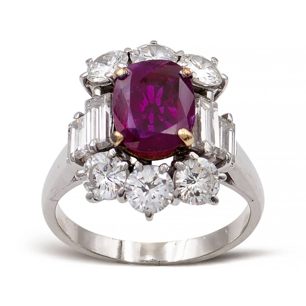 Anello in oro bianco 18kt con rubino ovaleanni 40/50peso 5,9 gr.ct 1,60 circa contornato da diamanti taglio brillante e baguettes disposti a gradazione ct 1,30 circa, misura 7